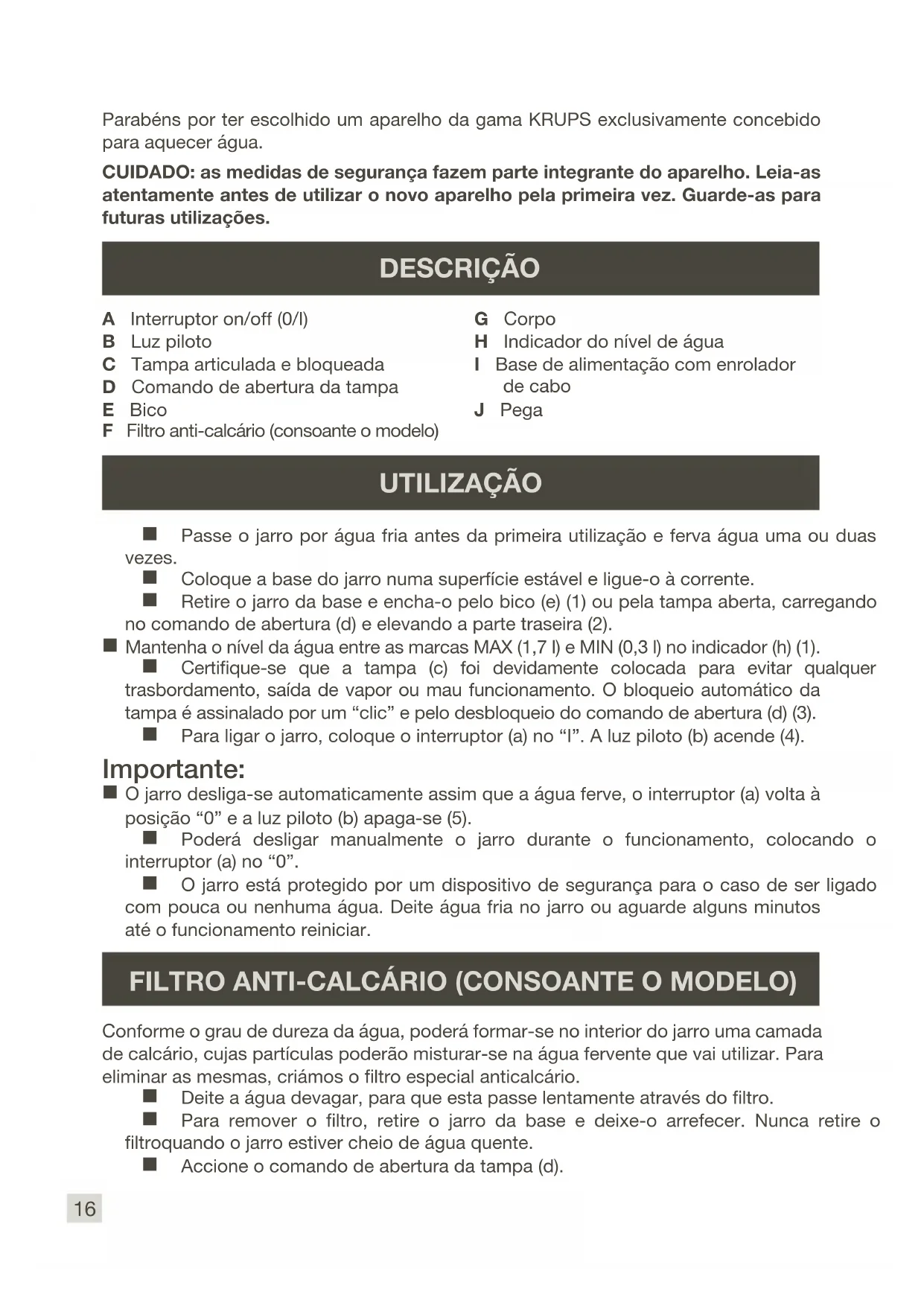 Baixe as instruções para o seu Chaleira em formato PDF gratuitamente! Encontre o seu manual AquaControl Plus FLA141 - KRUPS e retome o controlo do seu dispositivo eletrónico. Nesta página estão publicados todos os documentos necessários para a utilização do seu dispositivo. AquaControl Plus FLA141 da marca KRUPS.