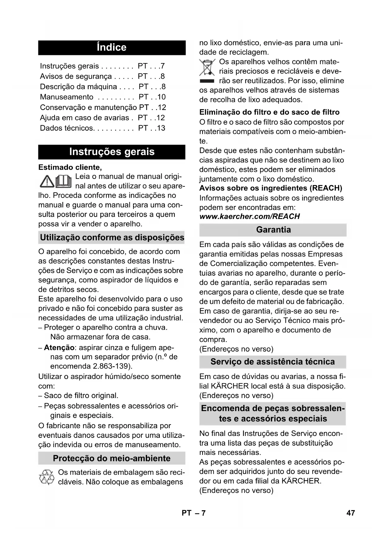 - J 1 45ES– 13 En el caso de aparatos con limpieza de filtro ExPress: Pulsar la tecla de limpieza del filtro 3 veces, si es necesa- rio repetir la limpieza con la manguera de aspiración cerrada (véase el capítu- lo "Limpiar el filtro plano de papel plega- do"). Limpiar con agua corriente el filtro si es necesario. Sustituir los filtros planos de papel ple- gado que estén dañados. La bolsa filtrante está llena: Colocar una bolsa filtrante nueva (Consulte el número de referencia en la lista de pie- zas de repuestos al final de este ma- nual). 몇 Atención: ¡No tirar el alojamiento de la bolsa filtrante! Los datos técnicos están en los laterales abatibles. A continuación aparece la expli- cación de los símbolos utilizados. Reservado el derecho a realizar modifi- caciones técnicas. Datos técnicos Tensión Potencia P nom Potencia P máx Potencia máx. de conexión al enchufe del aparato Fusible de red (inerte) Capacidad del depósito Absorción de agua con el asa Absorción de agua con boquilla para suelos Cable de conexión a la red Nivel de presión acústica (EN 60704-2-1) Peso sin accesorios 46 ES– 7 Estimado cliente, Leia o manual de manual origi- nal antes de utilizar o seu apare- lho. Proceda conforme as indicações no manual e guarde o manual para uma con- sulta posterior ou para terceiros a quem possa vir a vender o aparelho. O aparelho foi concebido, de acordo com as descrições constantes destas Instru- ções de Serviço e com as indicações sobre segurança, como aspirador de líquidos e de detritos secos. Este aparelho foi desenvolvido para o uso privado e não foi concebido para suster as necessidades de uma utilização industrial. – Proteger o aparelho contra a chuva. Não armazenar fora de casa. – Atenção: aspirar cinza e fuligem ape- nas com um separador prévio (n.º de encomenda 2.863-139). Utilizar o aspirador húmido/seco somente com: – Saco de filtro original. – Peças sobressalentes e acessórios ori- ginais e especiais. O fabricante não se responsabiliza por eventuais danos causados por uma utiliza- ção indevida ou erros de manuseamento. Os materiais de embalagem são reci- cláveis. Não coloque as embalagens no lixo doméstico, envie-as para uma uni- dade de reciclagem. Os aparelhos velhos contêm mate- riais preciosos e recicláveis e deve- rão ser reutilizados. Por isso, elimine os aparelhos velhos através de sistemas de recolha de lixo adequados. O filtro e o saco de filtro são compostos por materiais compatíveis com o meio-ambien- te. Desde que estes não contenham substân- cias aspiradas que não se destinem ao lixo doméstico, estes podem ser eliminados juntamente com o lixo doméstico. Avisos sobre os ingredientes (REACH) Informações actuais sobre os ingredientes podem ser encontradas em: www.kaercher.com/REACH Em cada país são válidas as condições de garantia emitidas pelas nossas Empresas de Comercialização competentes. Even- tuias avarias no aparelho, durante o perío- do de garantía, serão reparadas sem encargos para o cliente, desde que se trate de um defeito de material ou de fabricação. Em caso de garantia, dirija-se ao seu re- vendedor ou ao Serviço Técnico mais pró- ximo, com o aparelho e documento de compra. (Endereços no verso) Em caso de dúvidas ou avarias, a nossa fi- lial KÄRCHER local está à sua disposição. (Endereços no verso) No final das Instruções de Serviço encon- tra uma lista das peças de substituição mais necessárias. As peças sobressalentes e acessórios po- dem ser adquiridos junto do seu revende- dor ou em cada filial da KÄRCHER. (Endereços no verso) Índice Instruções gerais