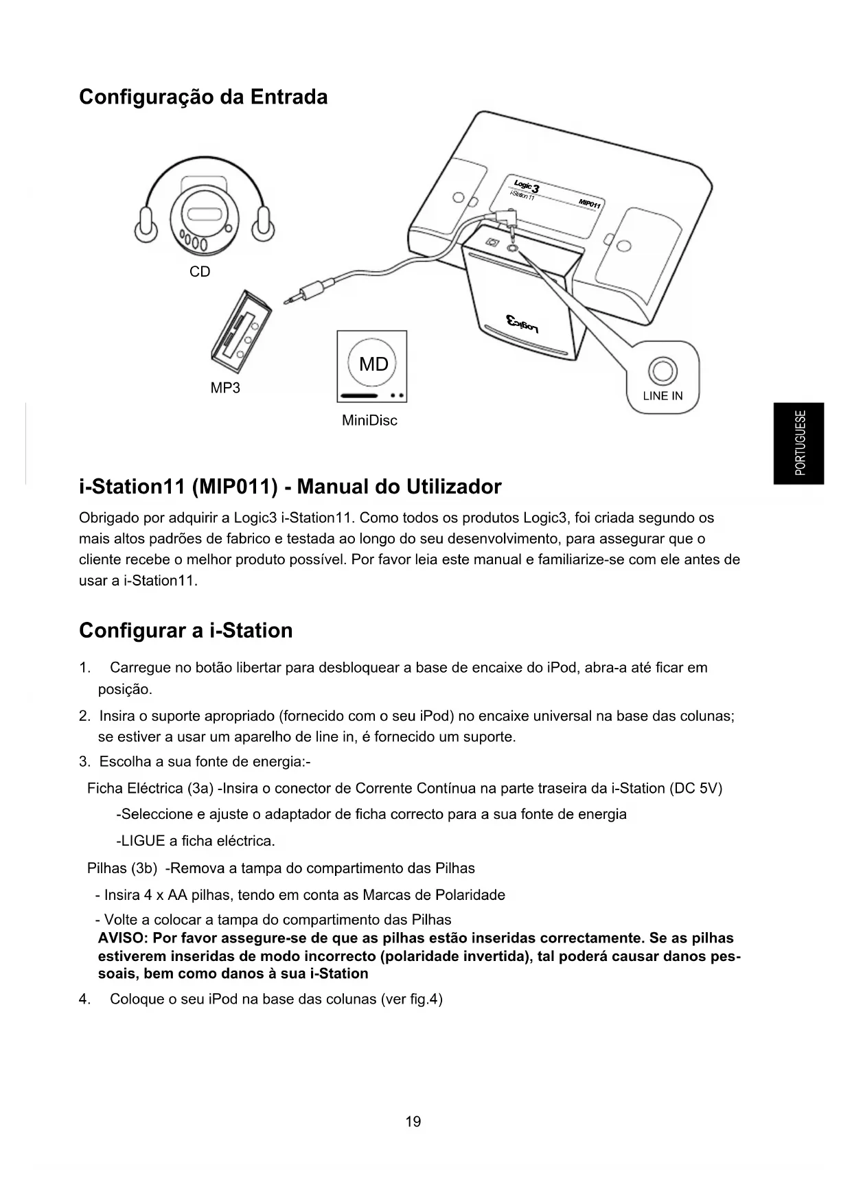 Ficha Eléctrica (3a) -Insira o conector de Corrente Contínua na parte traseira da i-Station (DC 5V) -Seleccioneeajusteoadaptadordechacorrectoparaasuafontedeenergia -LIGUEachaeléctrica. Pilhas (3b) -Remova a tampa do compartimento das Pilhas - Insira 4 x AA pilhas, tendo em conta as Marcas de Polaridade - Volte a colocar a tampa do compartimento das Pilhas AVISO: Por favor assegure-se de que as pilhas estão inseridas correctamente. Se as pilhas estiverem inseridas de modo incorrecto (polaridade invertida), tal poderá causar danos pes- soais, bem como danos à sua i-Station