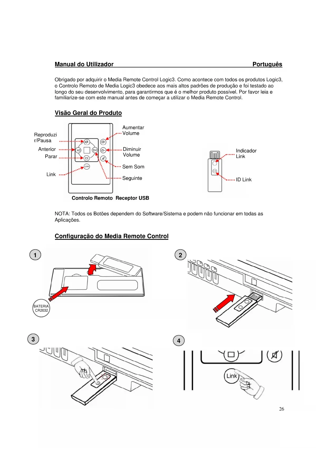 Reproduzi r/Pausa Seguinte Anterior Link Parar Sem Som Diminuir Volume Aumentar Volume Indicador Link ID Link Controlo Remoto Receptor USB BATERIA CR203227 Manual do Utilizador Português Configuração/Emparelhamento do Media Remote Control