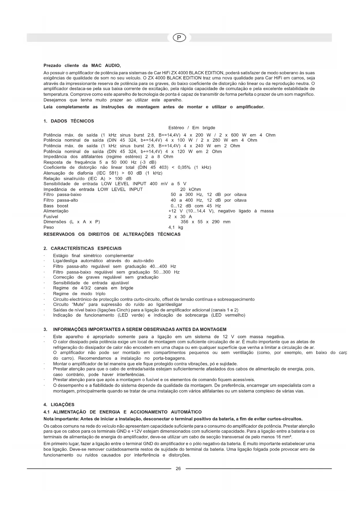 Prezado cliente da MAC AUDIO, Ao possuir o amplificador de potência para sistemas de Car HiFi ZX 4000 BLACK EDITION, poderá satisfazer de modo soberano às suas exigências de qualidade de som no seu veículo. O ZX 4000 BLACK EDITION traz uma nova qualidade para Car HiFi em carros, seja através da impressionante reserva de potência para os graves, do baixo coeficiente de distorção não linear ou da reprodução neutra. O amplificador destaca-se pela sua baixa corrente de excitação, pela rápida capacidade de comutação e pela excelente estabilidade de temperatura. Comprove como este aparelho de tecnologia de ponta é capaz de transmitir de forma perfeita o prazer de um som magnífico. Desejamos que tenha muito prazer ao utilizar este aparelho. Leia completamente as instruções de montagem antes de montar e utilizar o amplificador.