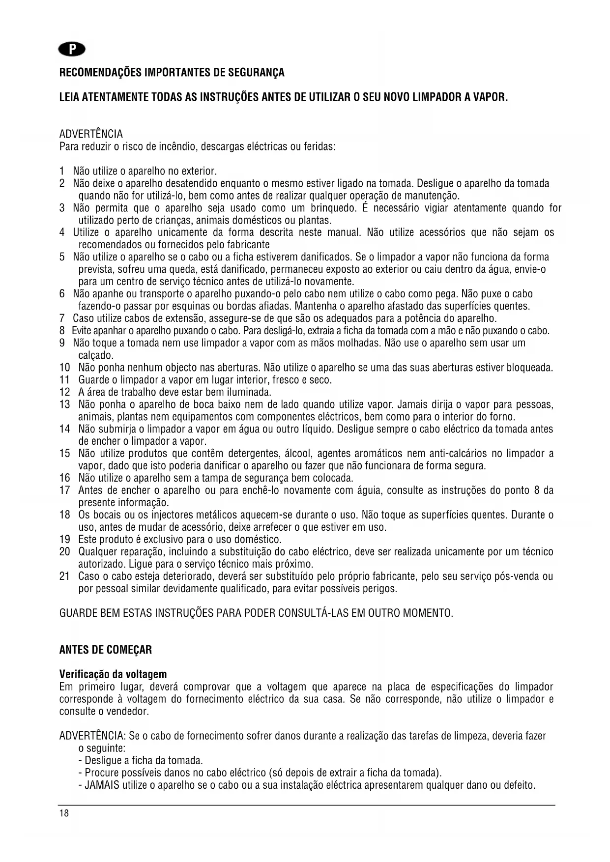 Em primeiro lugar,deeracomprovarqueavoltagemqueaparece naplaecdeespecificaçõesdo limpador corresponda voltagem do fornecimento eletrico da sua casa. Se não corresponde, nãoutilizeolimpador e consulte o vendedor.