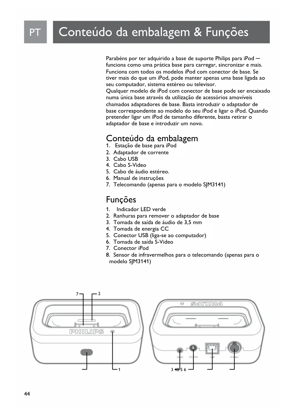 Índice44 Parabéns por ter adquirido a base de suporte Philips para iPod ─ funciona como uma prática base para carregar, sincronizar e mais. Funciona com todos os modelos iPod com conector de base. Se tiver mais do que um iPod, pode manter apenas uma base ligada ao seu computador, sistema estéreo ou televisor. Qualquer modelo de iPod com conector de base pode ser encaixado numa única base através da utilização de acessórios amovíveis chamados adaptadores de base. Basta introduzir o adaptador de base correspondente ao modelo do seu iPod e ligar o iPod. Quando pretender ligar um iPod de tamanho diferente, basta retirar o adaptador de base e introduzir um novo. Conteúdo da embalagem