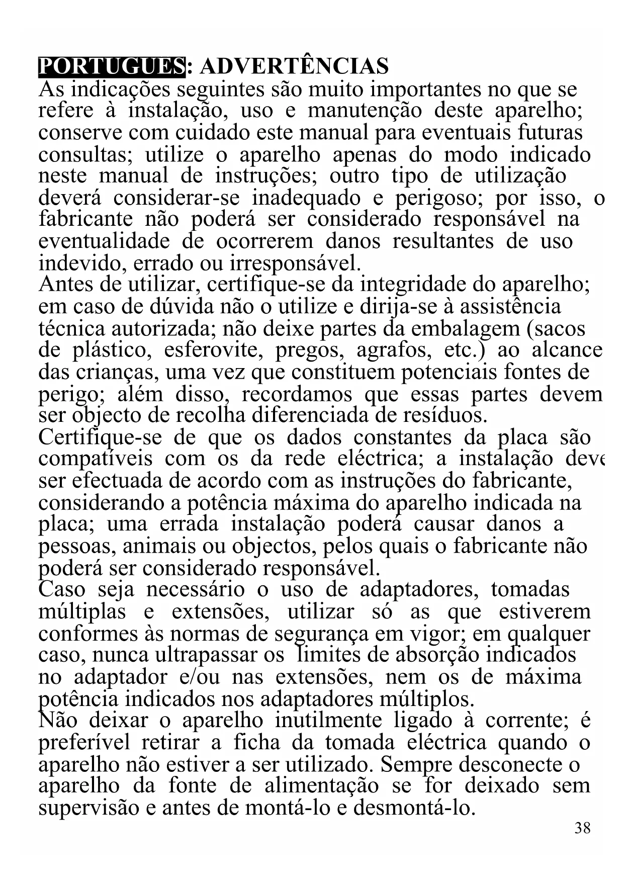 As indicações seguintes são muito importantes no que se refere à instalação, uso e manutenção deste aparelho; conserve com cuidado este manual para eventuais futuras consultas; utilize o aparelho apenas do modo indicado neste manual de instruções; outro tipo de utilização deverá considerar-se inadequado e perigoso; por isso, o fabricante não poderá ser considerado responsável na eventualidade de ocorrerem danos resultantes de uso indevido, errado ou irresponsável. Antes de utilizar, certifique-se da integridade do aparelho; em caso de dúvida não o utilize e dirija-se à assistência técnica autorizada; não deixe partes da embalagem (sacos de plástico, esferovite, pregos, agrafos, etc.) ao alcance das crianças, uma vez que constituem potenciais fontes de perigo; além disso, recordamos que essas partes devem ser objecto de recolha diferenciada de resíduos. Certifique-se de que os dados constantes da placa são compatíveis com os da rede eléctrica; a instalação deve ser efectuada de acordo com as instruções do fabricante, considerando a potência máxima do aparelho indicada na placa; uma errada instalação poderá causar danos a pessoas, animais ou objectos, pelos quais o fabricante não poderá ser considerado responsável. Caso seja necessário o uso de adaptadores, tomadas múltiplas e extensões, utilizar só as que estiverem conformes às normas de segurança em vigor; em qualquer caso, nunca ultrapassar os limites de absorção indicados no adaptador e/ou nas extensões, nem os de máxima potência indicados nos adaptadores múltiplos. Não deixar o aparelho inutilmente ligado à corrente; é preferível retirar a ficha da tomada eléctrica quando o aparelho não estiver a ser utilizado. Sempre desconecte o aparelho da fonte de alimentação se for deixado sem supervisão e antes de montá-lo e desmontá-lo.39 As operações de limpeza devem ser efectuadas depois de se ter desligado a ficha da tomada eléctrica. Sempre que o aparelho estiver fora de uso e seja decidido não o reparar, recomenda-se a sua inutilização, cortando- lhe o cabo de alimentação; - Não expor o aparelho a condições atmosféricas adversas, como chuva, humidade, gelo, etc. Conserve-o em lugares secos. Não manusear ou tocar o aparelho com as mãos molhadas ou os pés descalços. - Não aproximar o cabo de alimentação de objectos cortantes ou de superfícies quentes, e não o puxar para arrancar a ficha da tomada eléctrica. Não deixe que ele fique pendurado na bancada onde a criança pode segurá- lo. Não utilizar o aparelho no caso de o cabo de alimentação ou a ficha se encontrarem danificados, ou em caso de curto-circuitos; Nessa eventualidade, leve o aparelho a um centro de assistência autorizado. - Este aparelho não pode ser usado por crianças, mesmo com mais de 8 anos. - Este aparelho pode ser por pessoas com reduzida capacidade física, sensorial ou mental, ou ainda com falta de experiência na sua utilização, desde que lhes seja assegurada uma adequada supervisão ou se tiverem sido instruídas no uso do aparelho em segurança. - As crianças não devem brincar com o aparelho. - Mantenha o aparelho e o cabo de alimentação fora do alcance de crianças com menos de 8 anos de idade. - Não indicado para uso comercial. Só para uso doméstico. Em caso de avaria e/ou de mau funcionamento, não intervenha sobre o aparelho. Para uma eventual reparação dirija-se unicamente a um centro autorizado pelo fabricante e solicite peças de substituição originais. A não observância destas indicações pode comprometer a segurança do aparelho e tornar inválida a garantia.40 ATENÇÃO: este aparelho inclui uma função de aquecimento. Algumas superfícies, mesmo que não a placa propriamente dita, poderão atingir temperaturas elevadas. Uma vez que a sensibilidade à temperatura difere de pessoa para pessoa, este aparelho deverá ser usado com CUIDADO. Coloque o aparelho exclusivamente sobre superfícies com aderência e preparadas para o efeito, e use as necessárias medidas de protecção contra o calor, como pegas ou luvas. - Este aparelho foi concebido para uso doméstico ou equivalente, em situações como as de refeitórios em pequenas empresas ou outros ambientes de natureza laboral; por clientes de hotéis, motéis ou acomodação turística, como turismo rural ou residencial. - Antes de cada utilização, soltar o cabo de alimentação. - Utilizar somente acessórios e componentes originais. - Este aparelho não foi concebido para ser utilizado por intermédio de um temporizador externo ou de um sistema de comando à distância autónomo. - Não sujeite o produto a impactos, pois isso pode danificá-lo. Nunca mergulhar por nenhum motivo, o aparelho em água ou outros líquidos. - Não utilizar o aparelho na presença de explosivos, substâncias altamente inflamáveis, gás ou chamas acesas. Não usar o aparelho próximo da banheira, chuveiro ou lavatório, ou onde a presença de água possa dar uma fonte de perigo potencial. ATENÇÃO, RISCO DE INCÊNDIO: não deixe cair materiais combustíveis como óleo, farinha, incrustações de massa, etc. sobre a pedra, pois podem inflamar-se a altas temperaturas, provocando chamas. Se tais materiais caírem sobre a pedra, desligue o forno e retire-os da pedra. Se notar chamas no interior do forno, desligue imediatamente o forno desligando-o41 da corrente, deixe-o arrefecer e depois retire da pedra os materiais causadores do incêndio. - Desligar o fio da tomada da corrente quando o aparelho não está para ser utilizado ou durante a sua limpeza. - Quando se utiliza o forno, deixar pelo menos 10 cm de espaço em torno ao forno para favorecer uma apropriada circulação de ar. - Não introduzir alimentos de excessivas dimensões ou utensilhos metálicos: podem provocar incêndios ou choques elétricos. - Não apoiar objetos sobre o forno quando é em funcionamento. Se o forno vier coberto ou entra em contato com materi
