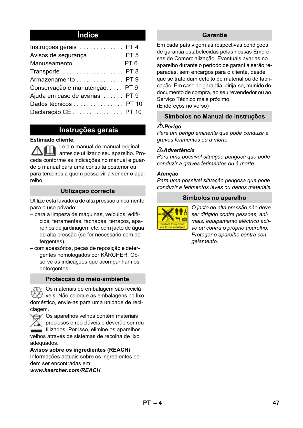89 dB(A) 45ES– 11 Por la presente declaramos que la máquina de- signada a continuación cumple, tanto en lo que respecta a su diseño y tipo constructivo como a la versión puesta a la venta por nosotros, las normas básicas de seguridad y sobre la salud que figuran en las directivas comunitarias co- rrespondientes. La presente declaración perde- rá su validez en caso de que se realicen modificaciones en la máquina sin nuestro con- sentimiento explícito. Los abajo firmantes actúan con plenos poderes y con la debida autorización de la dirección de la empresa. Persona autorizada para la documentación: S. Reiser Alfred Kärcher GmbH & Co. KG Alfred-Kärcher-Str. 28 - 40 71364 Winnenden (Germany) Tfno.: +49 7195 14-0 Fax: +49 7195 14-2212 Winnenden, 2012/01/01 Declaración de conformidad CE Producto: Limpiadora a alta presión Modelo: 1.674-xxx Directivas comunitarias aplicables 2006/42/CE (+2009/127/CE) 2004/108/CE 2000/14/CE Normas armonizadas aplicadas EN 55014–1: 2006 + A1: 2009 EN 55014–2: 1997 + A2: 2008 EN 60335–1 EN 60335–2–79 EN 61000–3–2: 2006 + A2: 2009 EN 61000–3–3: 2008 EN 62233: 2008 Procedimiento de evaluación de la conformi- dad aplicado 2000/14/CE: Anexo V Nivel de potencia acústica dB(A) Medido: 86 Garantizado: 89 CEO Head of Approbation 46 ES– 4 Estimado cliente, Leia o manual de manual original antes de utilizar o seu aparelho. Pro- ceda conforme as indicações no manual e guar- de o manual para uma consulta posterior ou para terceiros a quem possa vir a vender o apa- relho. Utilize esta lavadora de alta pressão unicamente para o uso privado: – para a limpeza de máquinas, veículos, edifí- cios, ferramentas, fachadas, terraços, apa- relhos de jardinagem etc. com jacto de água de alta pressão (se for necessário com de- tergentes). – com acessórios, peças de reposição e deter- gentes homologados por KÄRCHER. Ob- serve as indicações que acompanham os detergentes. Os materiais de embalagem são reciclá- veis. Não coloque as embalagens no lixo doméstico, envie-as para uma unidade de reci- clagem. Os aparelhos velhos contêm materiais preciosos e recicláveis e deverão ser reu- tilizados. Por isso, elimine os aparelhos velhos através de sistemas de recolha de lixo adequados. Avisos sobre os ingredientes (REACH) Informações actuais sobre os ingredientes po- dem ser encontradas em: www.kaercher.com/REACH Em cada país vigem as respectivas condições de garantia estabelecidas pelas nossas Empre- sas de Comercialização. Eventuais avarias no aparelho durante o período de garantia serão re- paradas, sem encargos para o cliente, desde que se trate dum defeito de material ou de fabri- cação. Em caso de garantia, dirija-se, munido do documento de compra, ao seu revendedor ou ao Serviço Técnico mais próximo. (Endereços no verso) Perigo Para um perigo eminente que pode conduzir a graves ferimentos ou à morte. 몇 Advertência Para uma possível situação perigosa que pode conduzir a graves ferimentos ou à morte. Atenção Para uma possível situação perigosa que pode conduzir a ferimentos leves ou danos materiais. O jacto de alta pressão não deve ser dirigido contra pessoas, ani- mais, equipamento eléctrico acti- vo ou contra o próprio aparelho. Proteger o aparelho contra con- gelamento. Índice Instruções gerais . . . . . . . . . . . . . PT 4 Avisos de segurança . . . . . . . . . . PT 5 Manuseamento. . . . . . . . . . . . . . . PT 6 Transporte . . . . . . . . . . . . . . . . . . PT 8 Armazenamento . . . . . . . . . . . . . . PT 9 Conservação e manutenção. . . . . PT 9 Ajuda em caso de avarias . . . . . . PT 9 Dados técnicos . . . . . . . . . . . . . . . PT 10 Declaração CE . . . . . . . . . . . . . . . PT 10 Instruções gerais Utilização correcta Protecção do meio-ambiente Garantia Símbolos no Manual de Instruções Símbolos no aparelho 47PT– 5 Perigo Nunca tocar na ficha de rede e na tomada com as mãos molhadas. O aparelho não deve ser colocado em funciona- mento se o cabo de ligação à rede ou partes im- portantes do aparelho como, p. ex., dispositivos de segurança, mangueiras de alta pressão ou pistola de injecção estiverem danificadas. Antes de qualquer utilização do aparelho, verifi- car se o cabo de ligação à rede e a ficha de rede não apresentam quaisquer danos. O cabo de li- gação à rede danificado tem que ser imediata- mente substituído pela assistência técnica ou por um electricista autorizado. Verificar a mangueira de alta pressão a res- peito de danos antes de cada colocação em funcionamento. Substituir imediatamente uma mangueira de alta pressão danificada. É proibido pôr o aparelho em funcionamento em áreas com perigo de explosão. Na utilização do aparelho em zonas de perigo (p. ex. bombas de gasolina), deverão ser observa- das as respectivas normas de segurança. Os jactos de alta pressão podem ser perigo- sos em caso de uso incorrecto. O jacto não deve ser dirigido contra pessoas, animais, equipamento eléctrico activo ou contra o próprio aparelho. Não dirigir o jacto de alta pressão contra ter- ceiros ou contra si próprio para a limpeza de roupa ou sapatos. Não projectar jactos de água contra objec- tos, que contenham substâncias nocivas à saúde (p.ex. amianto). O jacto de alta pressão pode danificar pneus e as válvulas dos mesmos ou provocar até o seu rebentamento. O primeiro sinal de danos é a al- teração da cor do pneu. Os pneus / válvulas dos pneus danificados podem causar lesões mor- tais. Guardar pelo menos uma distância do jacto de 30 cm durante a limpeza de superfícies! Perigo de explosão! Não pulverizar líquidos inflamáveis. Nunca aspirar líquidos com teores de diluen- tes ou ácidos e dissolventes não diluídos! Trata-se de materiais como gasolina, diluen- tes de cores ou óleo combustível. A neblina de pulverização é altamente inflamável, ex- plosiva e tóxica. Não utilizar acetona, ácidos e dissolve