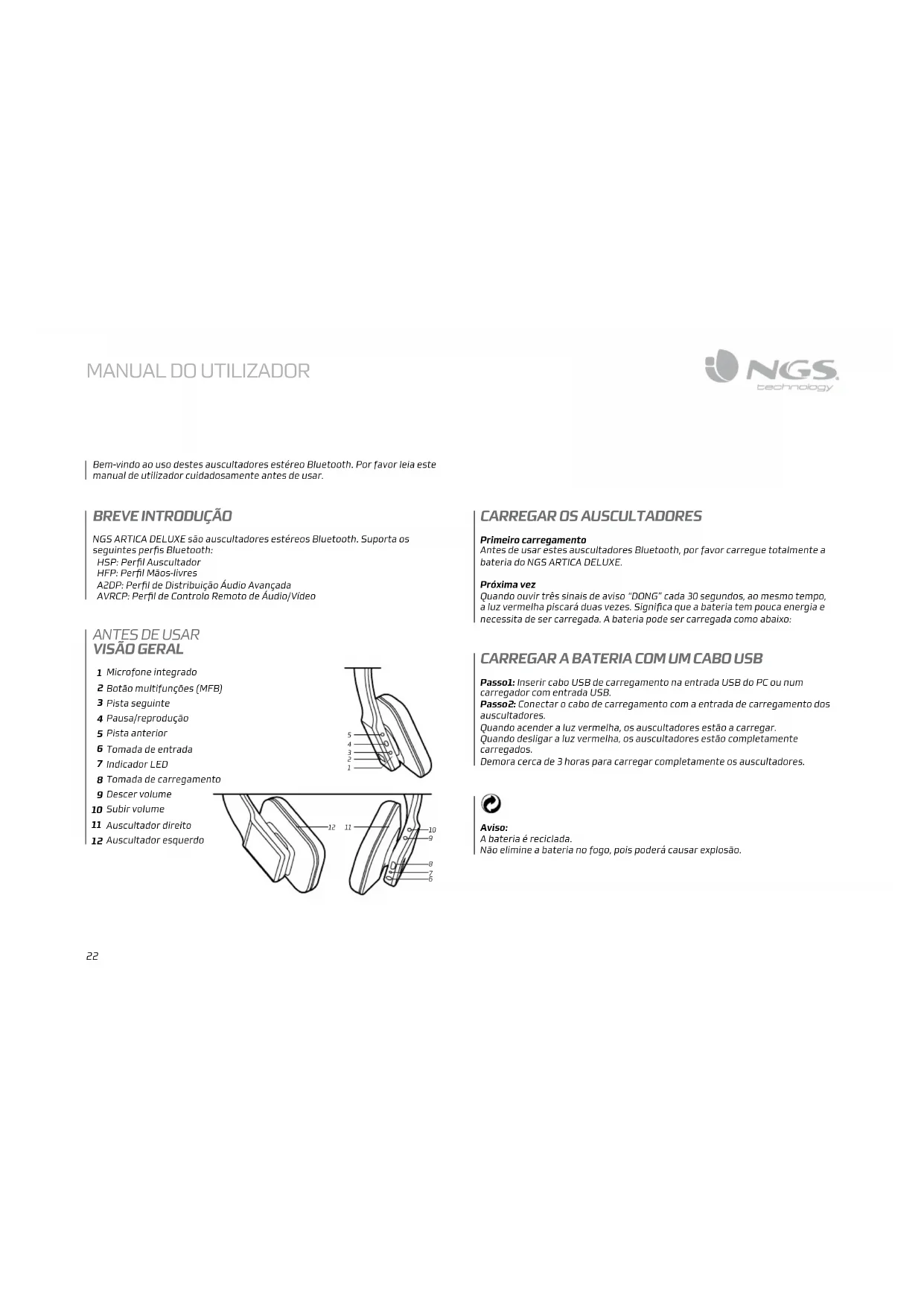 BREVE INTRODUÇÃO NGS ARTICA DELUXE são auscultadores estéreos Bluetooth. Suporta os