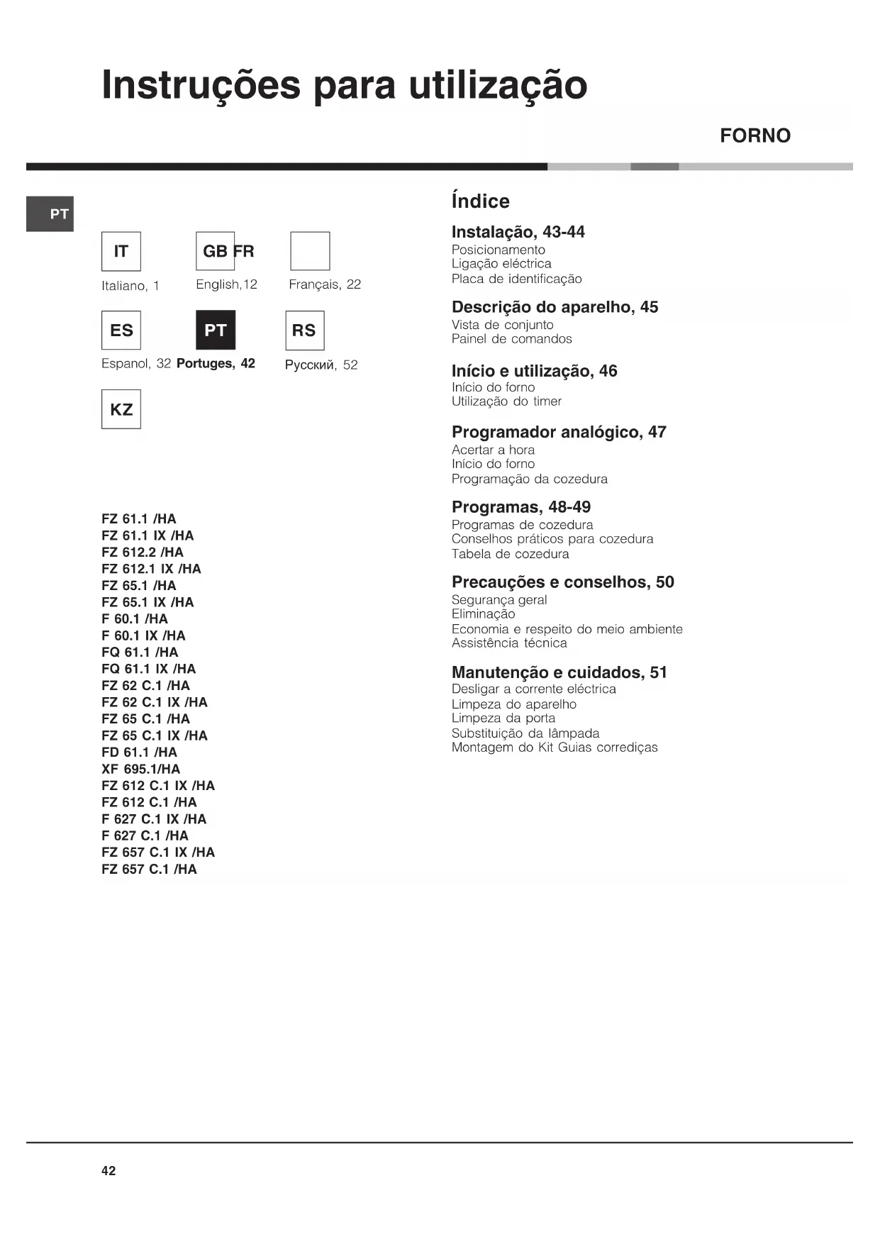 Instruções para utilização FZ 61.1 /HA FZ 61.1 IX /HA FZ 612.2 /HA FZ 612.1 IX /HA FZ 65.1 /HA FZ 65.1 IX /HA F 60.1 /HA F 60.1 IX /HA FQ 61.1 /HA FQ 61.1 IX /HA FZ 62 C.1 /HA FZ 62 C.1 IX /HA FZ 65 C.1 /HA FZ 65 C.1 IX /HA FD 61.1 /HA XF 695.1/HA FZ 612 C.1 IX /HA FZ 612 C.1 /HA F 627 C.1 IX /HA F 627 C.1 /HA FZ 657 C.1 IX /HA FZ 657 C.1 /HA Índice Instalação, 43-44 Posicionamento Ligação eléctrica Placa de identificação Descrição do aparelho, 45 Vista de conjunto Painel de comandos Início e utilização, 46 Início do forno Utilização do timer Programador analógico, 47 Acertar a hora Início do forno Programação da cozedura Programas, 48-49 Programas de cozedura Conselhos práticos para cozedura Tabela de cozedura Precauções e conselhos, 50 Segurança geral Eliminação Economia e respeito do meio ambiente Assistência técnica Manutenção e cuidados, 51 Desligar a corrente eléctrica Limpeza do aparelho Limpeza da porta Substituição da lâmpada Montagem do Kit Guias corrediças FORNO