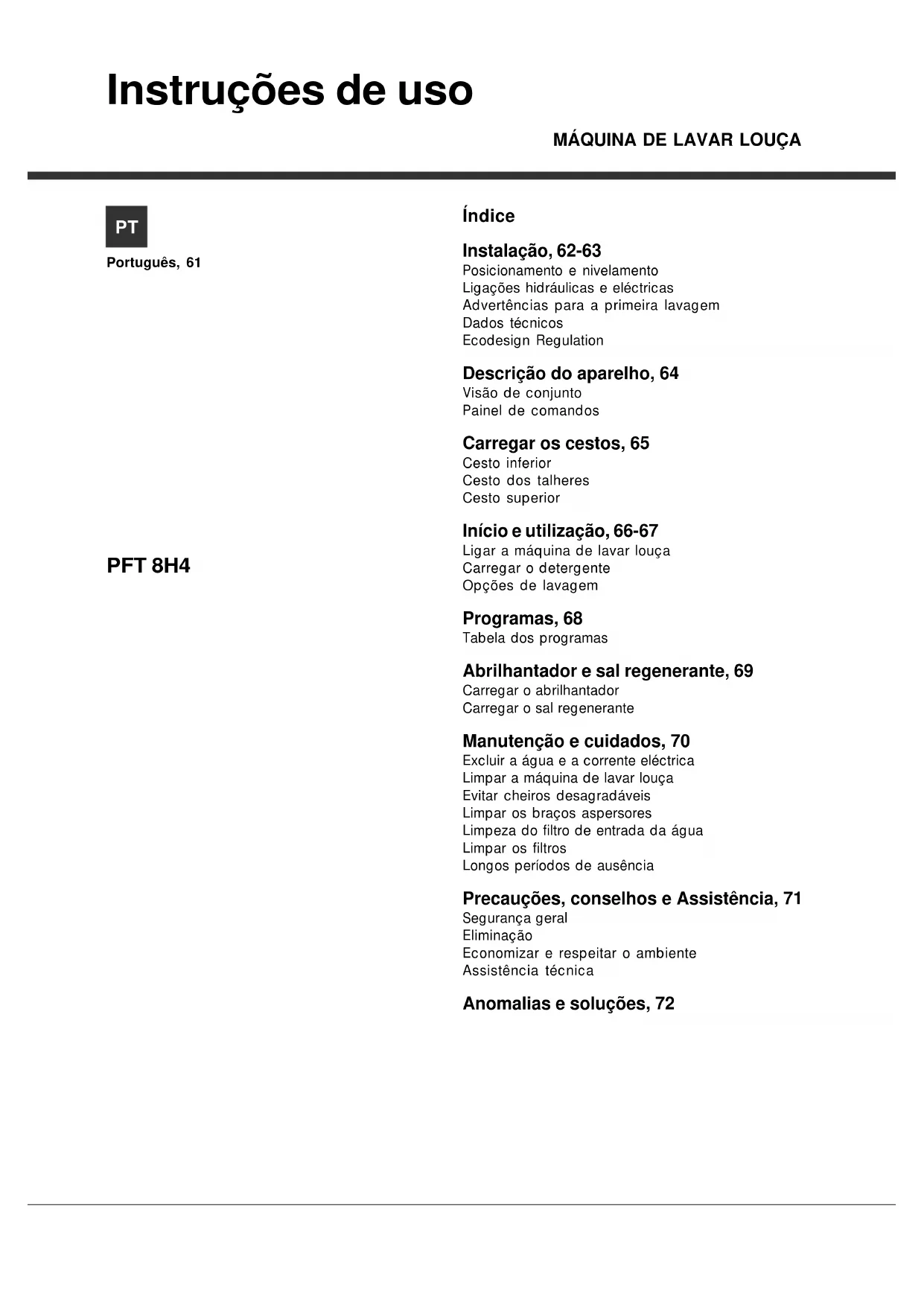 - Presente sólo en algunos modelos.MÁQUINA DE LAVAR LOUÇA Índice Instalação, 62-63 Posicionamento e nivelamento Ligações hidráulicas e eléctricas Advertências para a primeira lavagem Dados técnicos Ecodesign Regulation Descrição do aparelho, 64 Visão de conjunto Painel de comandos Carregar os cestos, 65 Cesto inferior Cesto dos talheres Cesto superior Início e utilização, 66-67 Ligar a máquina de lavar louça Carregar o detergente Opções de lavagem Programas, 68 Tabela dos programas Abrilhantador e sal regenerante, 69 Carregar o abrilhantador Carregar o sal regenerante Manutenção e cuidados, 70 Excluir a água e a corrente eléctrica Limpar a máquina de lavar louça Evitar cheiros desagradáveis Limpar os braços aspersores Limpeza do filtro de entrada da água Limpar os filtros Longos períodos de ausência Precauções, conselhos e Assistência, 71 Segurança geral Eliminação Economizar e respeitar o ambiente Assistência técnica Anomalias e soluções, 72 Português, 61