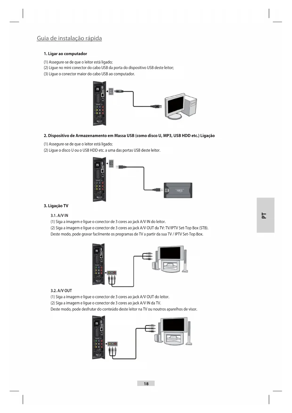 3.1. A/V IN (1) Siga a imagem e ligue o conector de 3 cores ao jack A/V IN do leitor. (2) Siga a imagem e ligue o conector de 3 cores ao jack A/V OUT da TV: TV/IPTV Set-Top Box (STB). Deste modo, pode gravar facilmente os programas de TV a partir da sua TV / IPTV Set-Top Box.