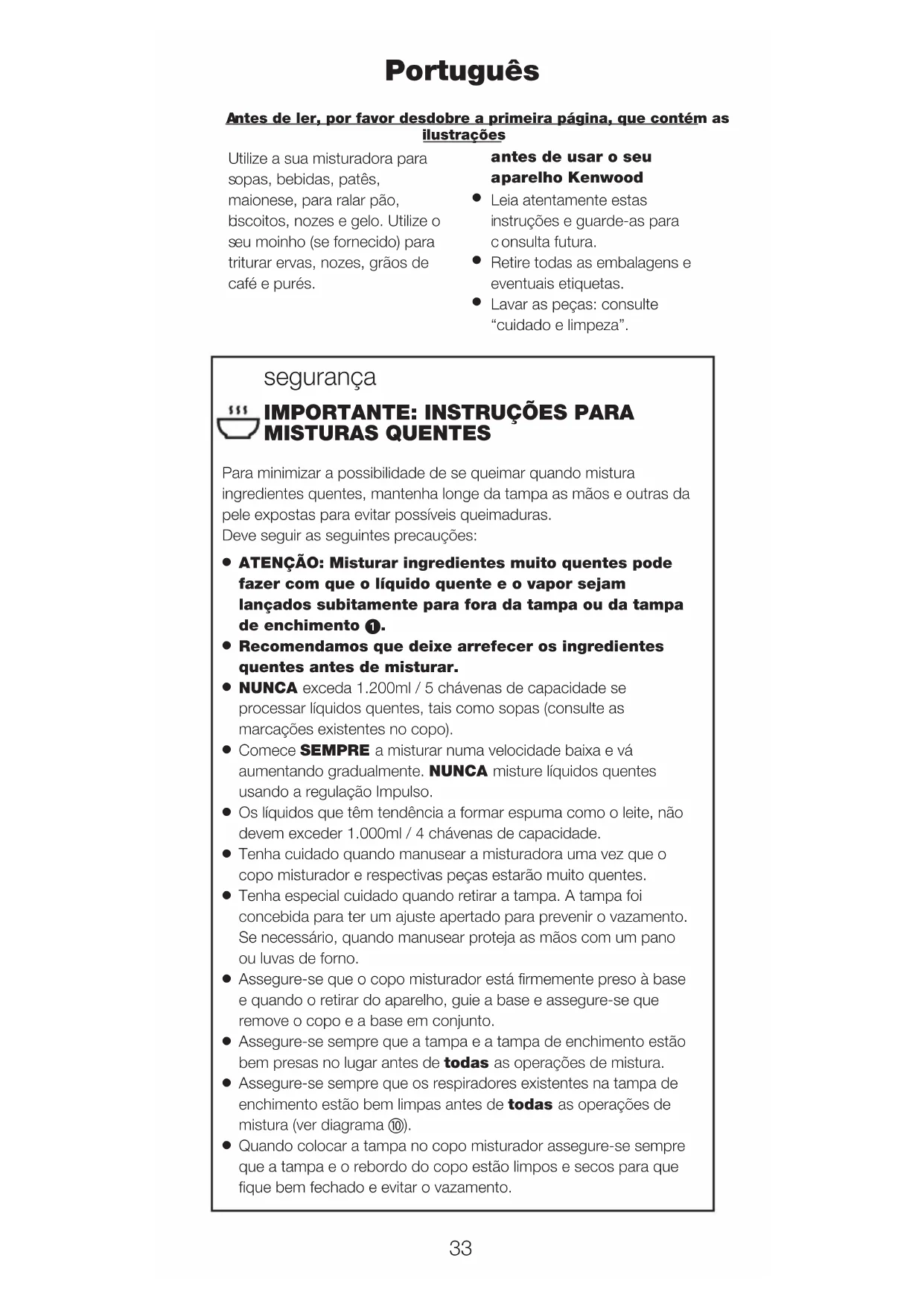 IMPORTANTE: INSTRUÇÕES PARA MISTURAS QUENTES Para minimizar a possibilidade de se queimar quando mistura