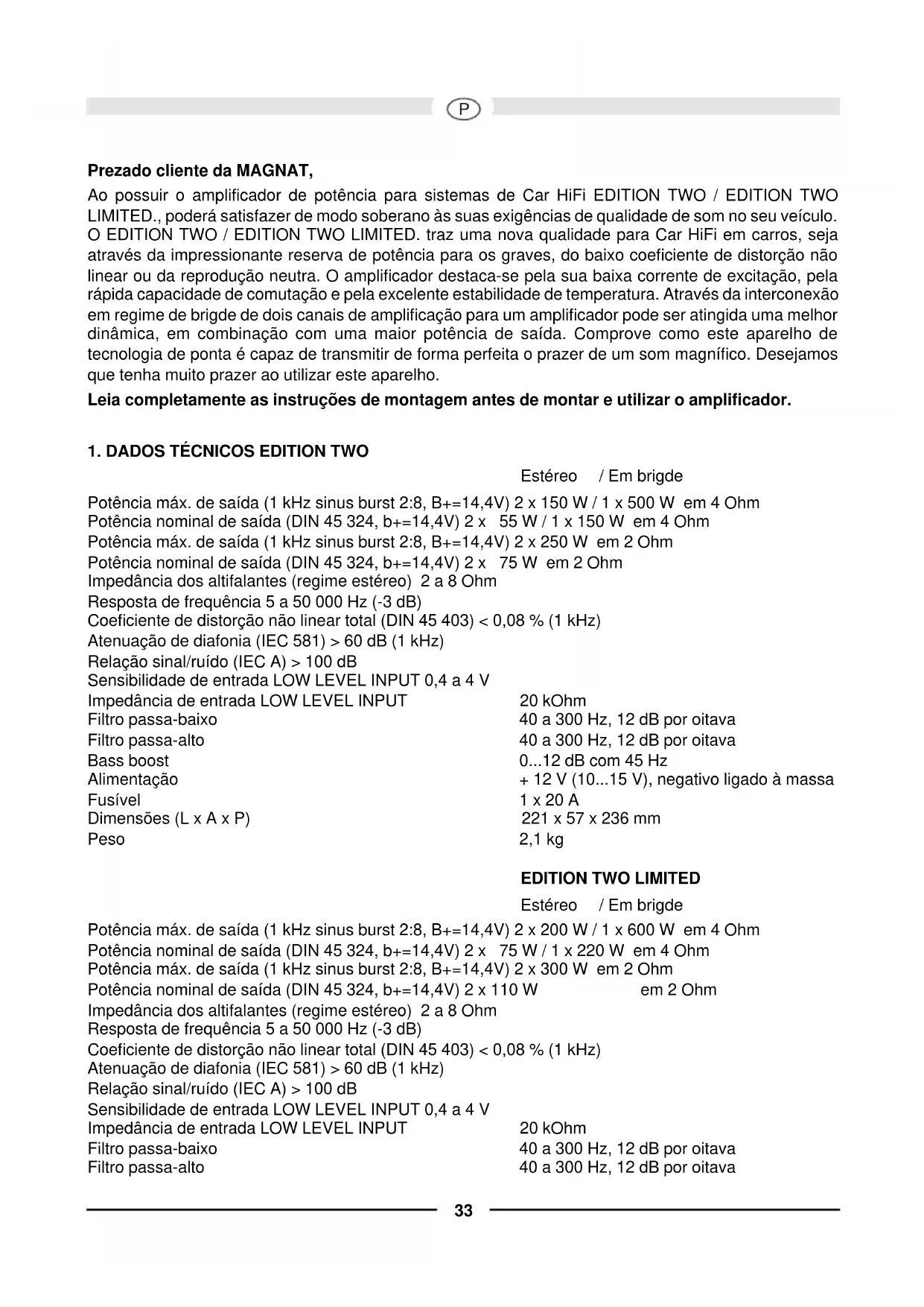 Prezado cliente da MAGNAT, Ao possuir o amplificador de potência para sistemas de Car HiFi EDITION TWO / EDITION TWO LIMITED., poderá satisfazer de modo soberano às suas exigências de qualidade de som no seu veículo. O EDITION TWO / EDITION TWO LIMITED. traz uma nova qualidade para Car HiFi em carros, seja através da impressionante reserva de potência para os graves, do baixo coeficiente de distorção não linear ou da reprodução neutra. O amplificador destaca-se pela sua baixa corrente de excitação, pela rápida capacidade de comutação e pela excelente estabilidade de temperatura. Através da interconexão em regime de brigde de dois canais de amplificação para um amplificador pode ser atingida uma melhor dinâmica, em combinação com uma maior potência de saída. Comprove como este aparelho de tecnologia de ponta é capaz de transmitir de forma perfeita o prazer de um som magnífico. Desejamos que tenha muito prazer ao utilizar este aparelho. Leia completamente as instruções de montagem antes de montar e utilizar o amplificador.