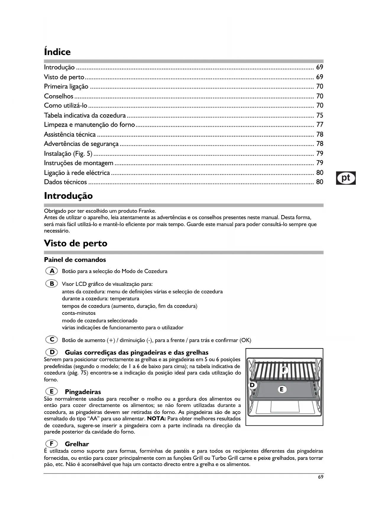 Painel de comandos Botão para a selecção do Modo de CozeduraVisor LCD gráfico de visualização para:antes da cozedura: menu de definições várias e selecção de cozeduradurante a cozedura: temperaturatempos de cozedura (aumento, duração, fim da cozedura)conta-minutosmodo de cozedura seleccionadovárias indicações de funcionamento para o utilizadorBotão de aumento (+) / diminuição (-), para a frente / para trás e confirmar (OK) Guias corrediças das pingadeiras e das grelhas Servem para posicionar correctamente as grelhas e as pingadeiras em 5 ou 6 posiçõespredefinidas (segundo o modelo; de 1 a 6 de baixo para cima); na tabela indicativa decozedura (pág. 75) encontra-se a indicação da posição ideal para cada utilização doforno. Pingadeiras São normalmente usadas para recolher o molho ou a gordura dos alimentos ouentão para cozer directamente os alimentos; se não forem utilizadas durante acozedura, as pingadeiras devem ser retiradas do forno. As pingadeiras são de aço esmaltado do tipo “AA” para uso alimentar. NOTA: Para obter melhores resultados de cozedura, sugere-se inserir a pingadeira com a parte inclinada na direcção daparede posterior da cavidade do forno. Grelhar
