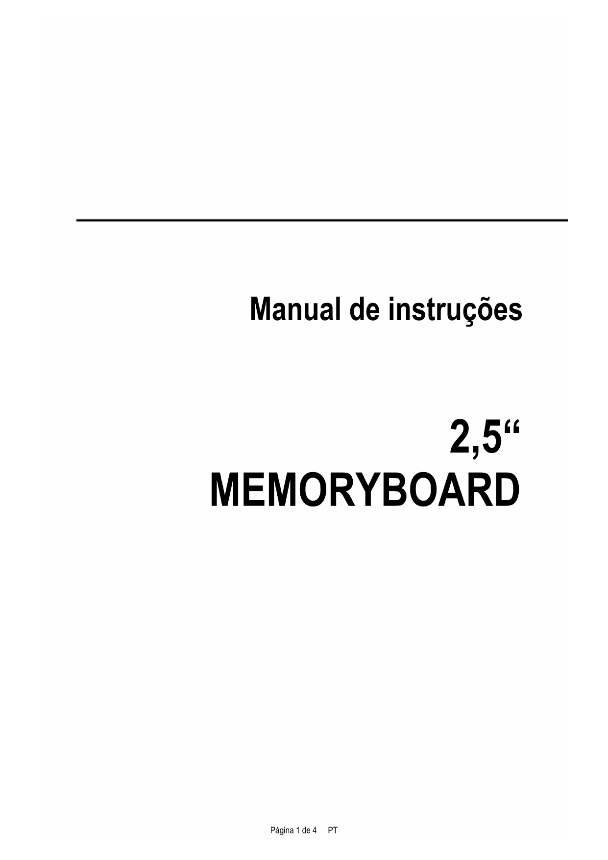 2,5“ MEMORYBOARDPágina 2 de 4 PT Âmbito de fornecimento Disco rígido USB 2.0 Intenso High-Speed Cabo USB 2.0 Manual de instruções + Cartão de garantia Informações técnicas Disco rígido externo 2,5“ USB 2.0 Medidas: 15 x 82 x 128 mm Velocidade de transferência máx. 480 MBit /seg (USB 2.0) Capacidade: 1MB = 1,000,000bytes / 1GB = 1,000,000,000 bytes Indicações de uso: Temperatura: Em uso: 5 °C até 55 °C Desligado: - 40 °C até 60 °C Umidade relativa do ar: Em uso, desligado: 8 % - 90 % Colisões, quedas Proteja o aparelho contra colisões ou quedas em qualquer situação de funcionamento. Não mova o aparelho durante o uso. Descarga Eletroestática: Este aparelho é sensível a descargas eletroestáticas. Proteja o aparelho de quaisquer descargas eletroestáticas. Eliminação de aparelhos domésticos Os aparelhos que vêm marcados com este símbolo estão sujeitos às normas européias 2002/96/EC. Todos os aparelhos elétricos e eletrodomésticos devem ser separados do lixo caseiro e depositados em lugares próprios, determinados pelo estado. Com a eliminação correta de aparelhos eletrodomésticos podem ser evitados danos no meio ambiente.Página 3 de 4 PT Instruções de instalação Requisitos do sistema: Este disco rígido é compatível com os sistemas operativos MS Windows XP/Vista / Windows 7 e Mac OS 10.x . Nota: A configuração de hardware do seu PC e o sistema operativo utilizado podem influenciar a compatibilidade do disco rígido. Ligar o disco rígido: