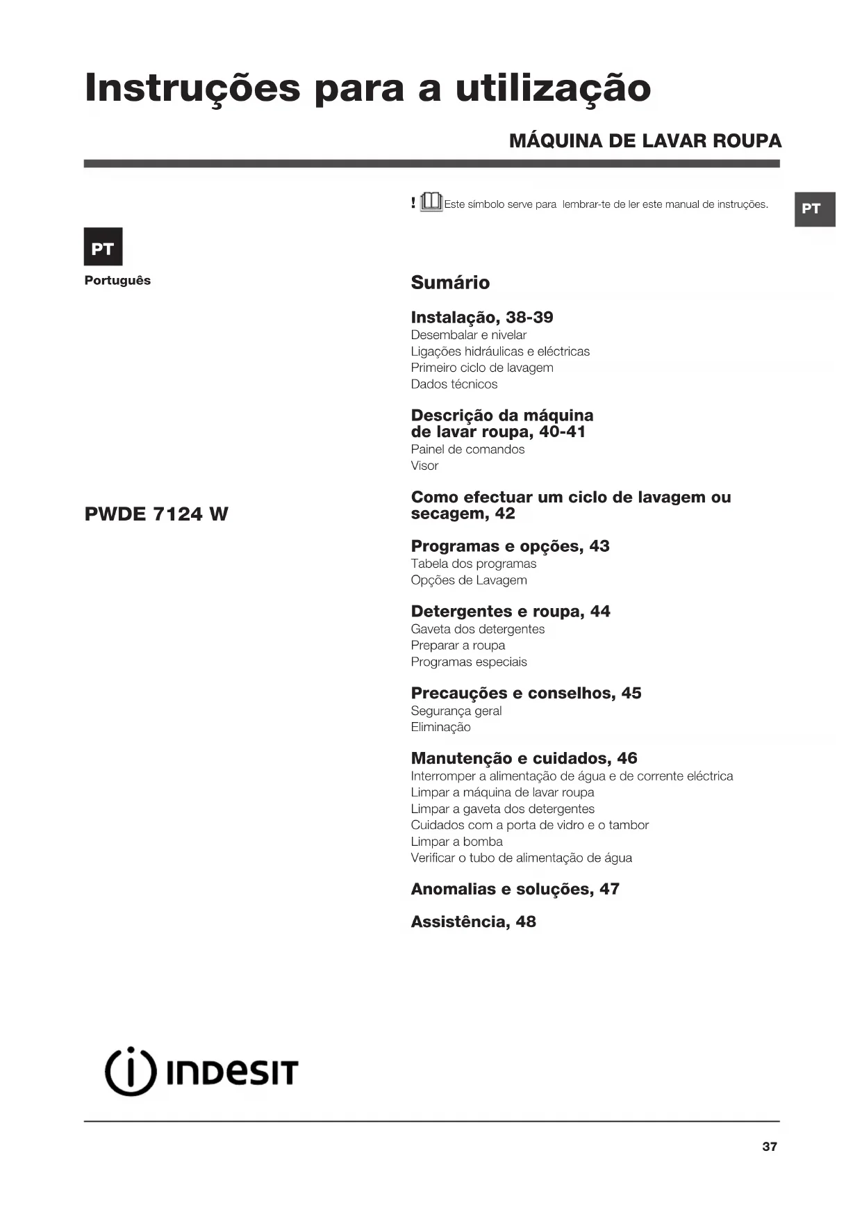 Encontre gratuitamente o manual do aparelho PWDE 7124 S INDESIT em formato PDF.