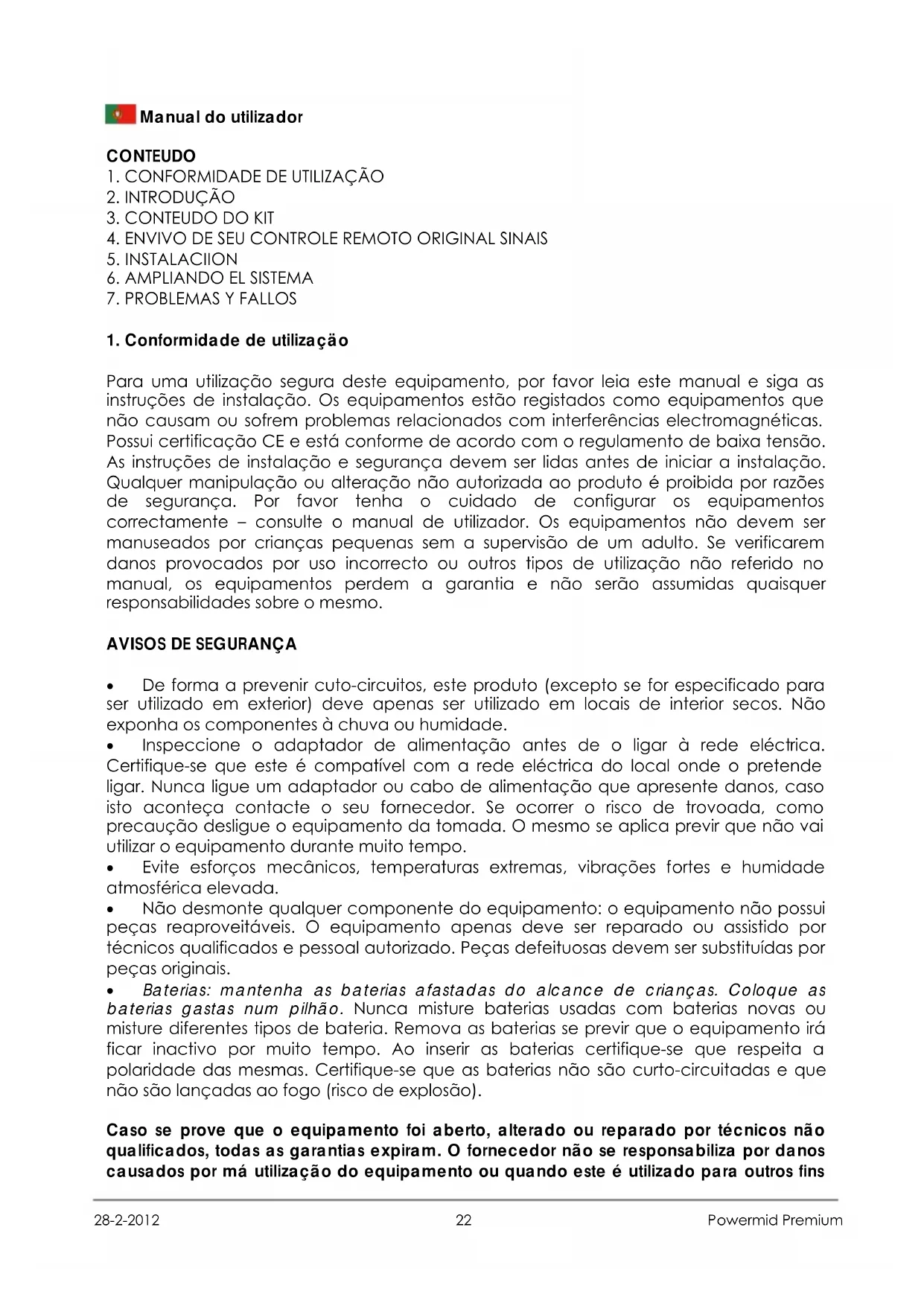 - Baterias: mantenha as baterias afastadas do alcance de crianças. Coloque as baterias gastas num pilhão. Nunca misture baterias usadas com baterias novas ou misture diferentes tipos de bateria. Remova as baterias se previr que o equipamento irá ficar inactivo por muito tempo. Ao inserir as baterias certifique-se que respeita a polaridade das mesmas. Certifique-se que as baterias não são curto-circuitadas e que não são lançadas ao fogo (risco de explosão). Caso se prove que o equipamento foi aberto, alterado ou reparado por técnicos não qualificados, todas as garantias expiram. O fornecedor não se responsabiliza por danos causados por má utilização do equipamento ou quando este é utilizado para outros fins28-2-2012 23 Powermid Premium não indicados pelo fabricante. O fornecedor não se responsabiliza por danos não cobertos pela responsabilidade legal do produto.