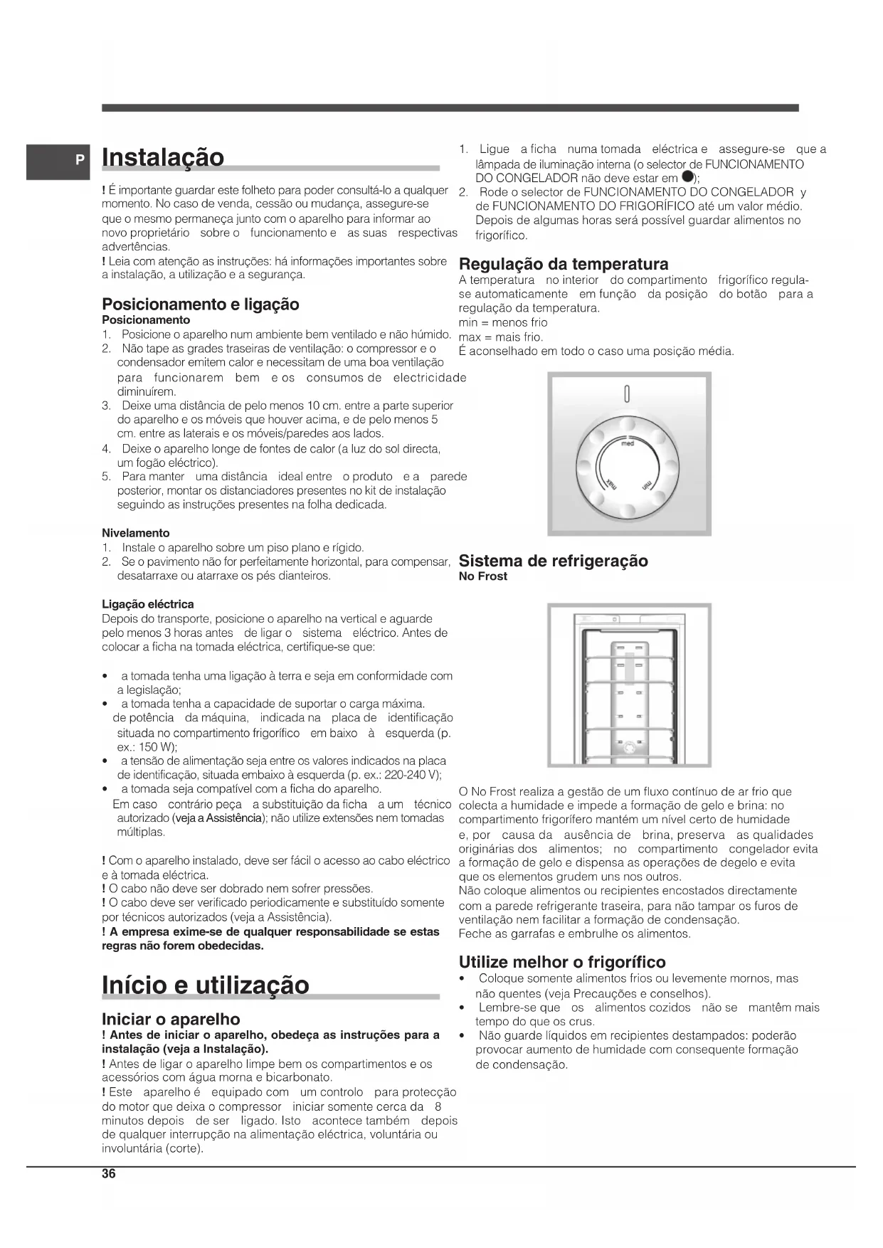 EstaaparelhageméemconformidadecomaseguintesDirectivasdaComunidadeEuropeia:-73/23/CEEdo19/02/73(BaixaTensão)esucessivasmodificações;-89/336/CEEdo03/05/89(CompatibilidadeElectromagnética)esucessivasmodificações. Segurança geral • Esteaparelhofoiconcebidoparaumautilizaçãodetiponãoprofissional,noâmbitodeumamorada.• Esteaparelhodeveserutilizadosomenteporpessoasadultas,paraconservarecongelaralimentos,segundoasinstruçõesapresentadasnestefolheto.• Esteaparelhonãodeveserinstaladoaoarlivremesmosenumsítioabrigado,porqueémuitoperigosodeixá-loexpostoàchuvaetemporais.• Nãotoquenesteaparelhocomospésdescalçosnemcomasmãosouospésmolhadosouhúmidos.• Nãotoquenaspartesderefrigeraçãointernas:háperigodequeimaduraseferidas.• Nãopuxeocaboeléctricoparadesligarafichadatomada,maspeguepelaficha.• Énecessáriodesligarafichadatomadaantesderealizaroperaçõesdelimpezaemanutenção.Nãoésuficientecolocarosselectores de regulação da temperatura na posição(aparelhodesligado) para eliminar todos os contactoseléctricos.• Nocasodeavaria,nuncamexanosmecanismosinternosparatentarreparar.• Nãoutilize,nointeriordoscompartimentos paraguardaralimentoscongelados,utensílioscortantesepontiagudosoudispositivoseléctricossenãoforemdotiporecomendadopeloconstrutor.• Nãocoloquenabocacubosdegeloassimqueosretirardocongelador.• Nãoéprevistoqueesteaparelhosejautilizadoporpessoas(inclusocrianças)comreduzidascapacidades físicas,sensoriaisoumentais,porpessoasinexperientesousemconhecimento,anãoserquesejamvigiadasouquetenhamrecebidoinstruçõespreliminaressobreousodoaparelhoporpartedeumapessoaresponsávelpelasuasegurança.Ascriançasdeveriamservigiadasparaevitarquebrinquemcomoaparelho.• Osembalagensnãosãobrinquedosparaascrianças. Eliminação • Eliminaçãodomaterialdeembalagem: obedeça as regraslocais,oureutilizeasembalagens.• AdirectivaEuropeia2002/96/CEreferenteàgestãoderesíduosdeaparelhoseléctricoseelectrónicos(RAEE),prevêqueoselectrodomésticos não devem ser escoados no fluxo normaldosresíduossólidosurbanos.Osaparelhosdesactualizadosdevemserrecolhidosseparadamenteparaoptimizara taxaderecuperaçãoereciclagemdosmateriaisqueoscompõemeimpedirpotenciaisdanosparaasaúdehumanaeparaoambiente.Osímboloconstituídoporumcontentordelixobarradocomumacruzdevesercolocadoemtodososprodutosporformaarecordaraobrigatoriedadederecolhaseparada. Osconsumidoresdevemcontactarasautoridades locaisouospontosdevendaparasolicitarinformaçãoreferenteaolocalapropriadoondedevemdepositaroselectrodomésticosvelhos. Economizar e respeitar o meio ambiente • Instaleesteaparelhonumambientefrescoebemventilado,proteja-ocontraaexposiçãodirectaaosraiosdosol,nãoocoloquepertodefontesdecalor.• Paracolocarouretiraralimentos,abraasportasdesteaparelhoomaisrapidamentepossível.Cadavezqueabrirasportascausaumnotávelgastodeenergia.• Nãoenchaesteaparelhocomalimentosdemais:paraumaboaconservação,ofriodevepodercircularlivremente.Seimpedir-seacirculação,ocompressorfuncionarácontinuamente.• Não coloque dentro alimentos quentes: aumentarão atemperaturainternaforçandoocompressorafuncionarmuito,comgrandedesperdíciodeenergiaeléctrica.P