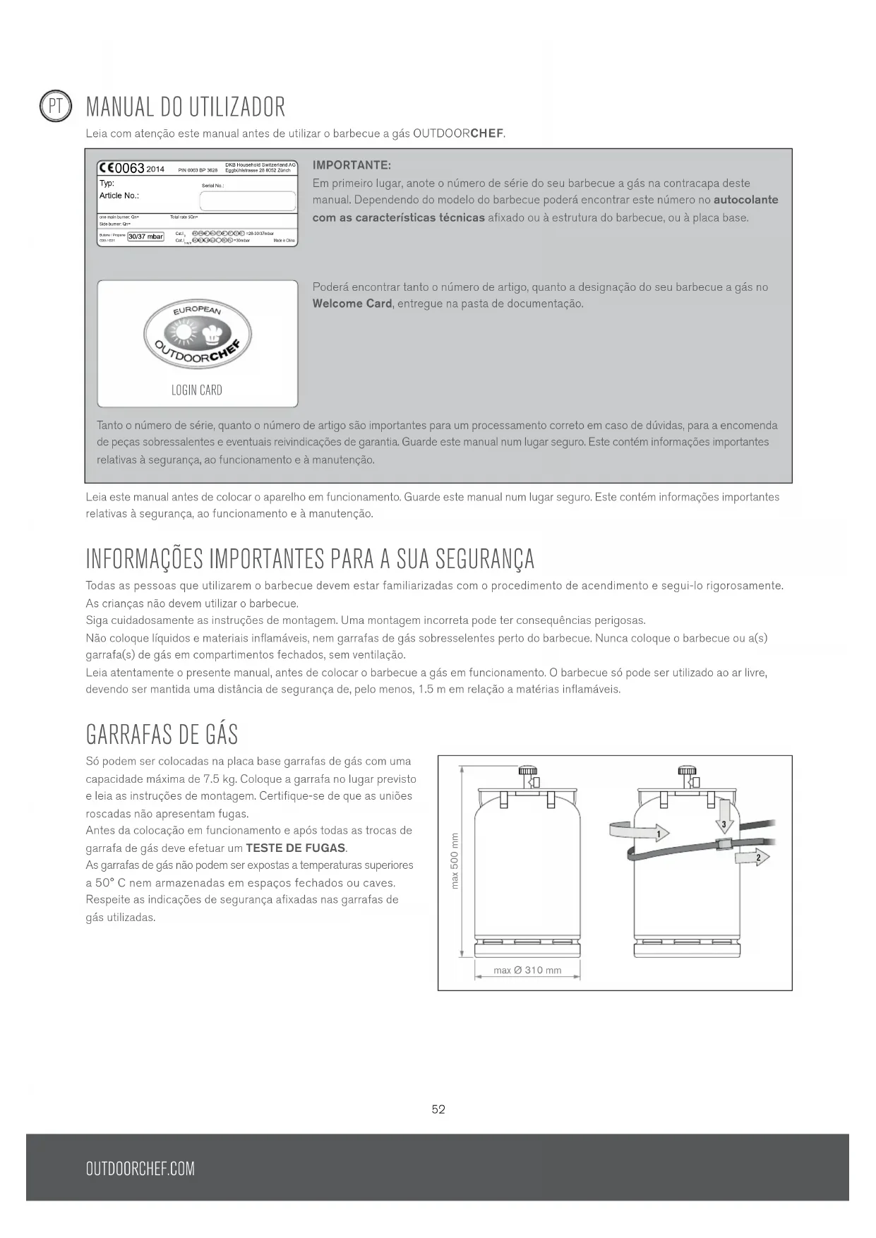 MANUAL DO UTILIzADOR Leia com atenção este manual antes de utilizar o barbecue a gás OUTDOORCHEF. Leia este manual antes de colocar o aparelho em funcionamento. Guarde este manual num lugar seguro. Este contém informações importantes relativas à segurança, ao funcionamento e à manutenção. INFORMAÇÕES IMPORTANTES PARA A SUA SEGURANÇA Todas as pessoas que utilizarem o barbecue devem estar familiarizadas com o procedimento de acendimento e segui-lo rigorosamente. As crianças não devem utilizar o barbecue. Siga cuidadosamente as instruções de montagem. Uma montagem incorreta pode ter consequências perigosas. Não coloque líquidos e materiais inflamáveis, nem garrafas de gás sobresselentes perto do barbecue. Nunca coloque o barbecue ou a(s) garrafa(s) de gás em compartimentos fechados, sem ventilação. Leia atentamente o presente manual, antes de colocar o barbecue a gás em funcionamento. O barbecue só pode ser utilizado ao ar livre, devendo ser mantida uma distância de segurança de, pelo menos, 1.5 m em relação a matérias inflamáveis. GARRAFAS DE GáS Só podem ser colocadas na placa base garrafas de gás com uma capacidade máxima de 7.5 kg. Coloque a garrafa no lugar previsto e leia as instruções de montagem. Certifique-se de que as uniões roscadas não apresentam fugas. Antes da colocação em funcionamento e após todas as trocas de garrafa de gás deve efetuar um TESTE DE FUGAS. As garrafas de gás não podem ser expostas a temperaturas superiores a 50° C nem armazenadas em espaços fechados ou caves. Respeite as indicações de segurança afixadas nas garrafas de gás utilizadas. max 500 mm max Ø 310 mm