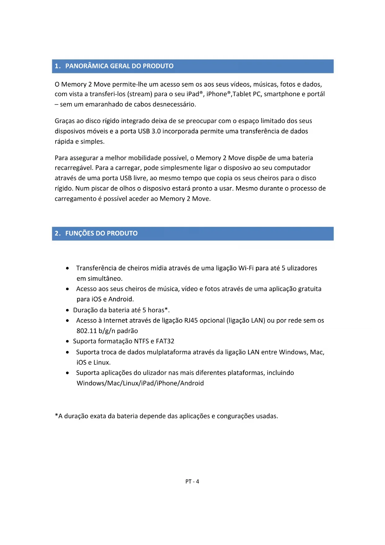 Suporta formatação NTFS e FAT32 Suporta troca de dados multiplataforma através da ligação LAN entre Windows, Mac, iOS e Linux. Suporta aplicações do utilizador nas mais diferentes plataformas, incluindo Windows/Mac/Linux/iPad/iPhone/Android *A duração exata da bateria depende das aplicações e configurações usadas.PT - 5 Utilização como disco externo: A porta USB 3.0 integrada permite uma transferência mais rápida de dados e consegue carregar a bateria interna, desde que o Memory 2 Move esteja conectado a um computador ou fonte de alimentação. No entanto, apenas funciona quando o dispositivo está apagado. Utilização através da ligação LAN: Para isso, ligue uma extremidade do seu cabo RJ45 ao Memory 2 Move e a outra à porta livre do seu router. Agora, ative a função DHCP no seu Memory 2 Move para uma atribuição automática do endereço IP.