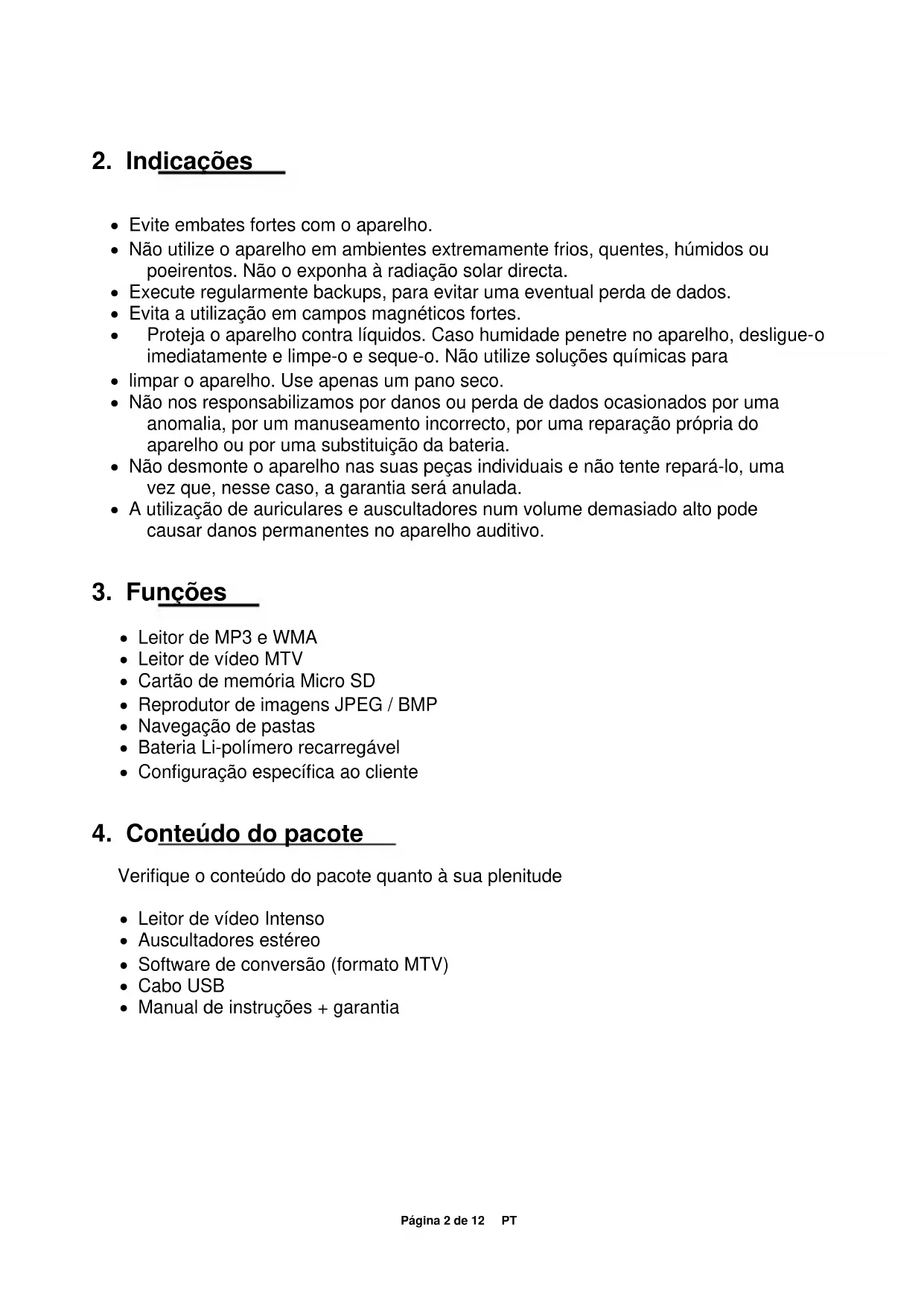Verifique o conteúdo do pacote quanto à sua plenitude Leitor de vídeo Intenso Auscultadores estéreo Software de conversão (formato MTV) Cabo USB Manual de instruções + garantiaPágina 3 de 12 PT