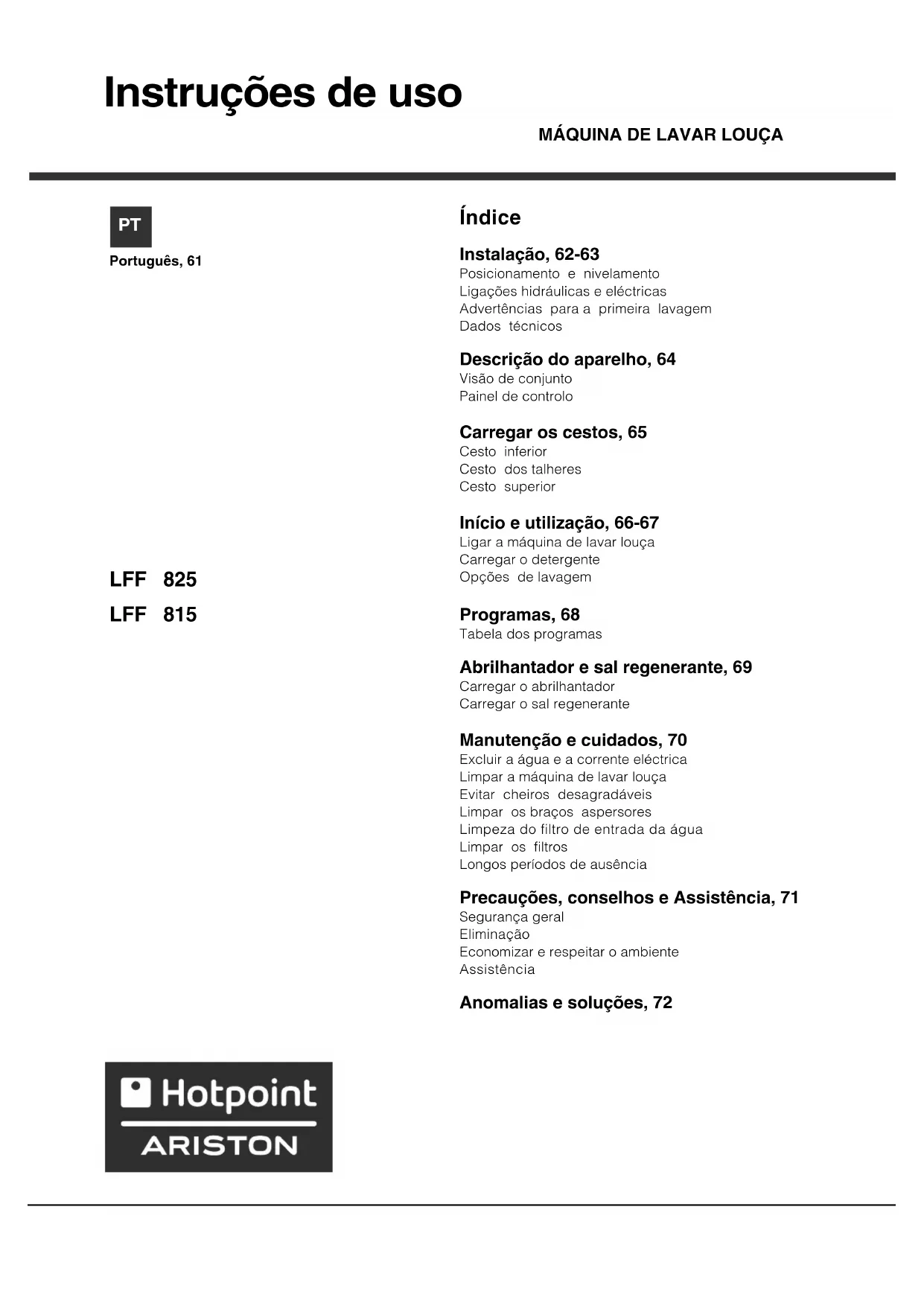 LFF 815 EUHA.R - Máquinas de lavar loiça HOTPOINT ARISTON - Manual de utilização gratuito