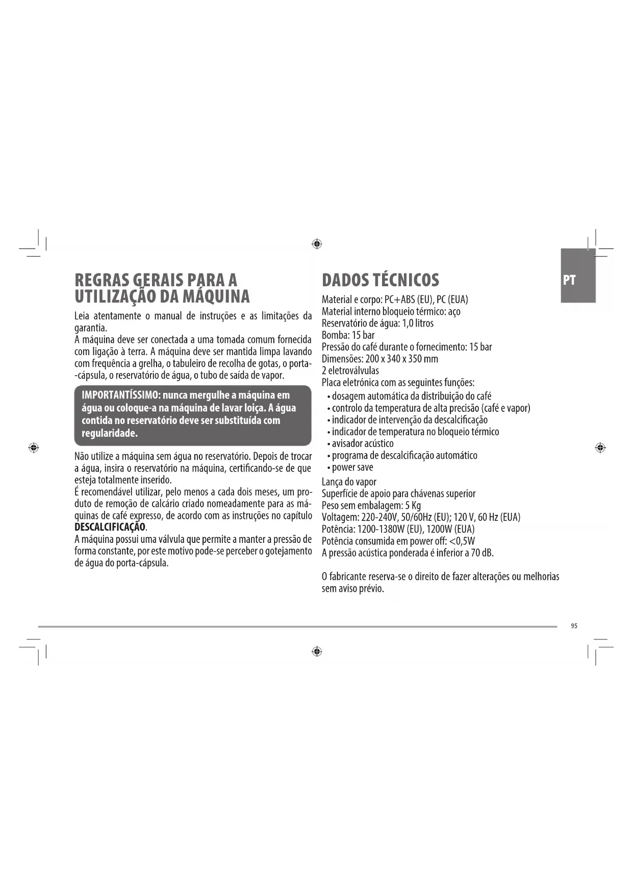 PT REGRAS GERAIS PARA A UTILIZAÇÃO DA MÁQUINA Leia atentamente o manual de instruções e as limitações da