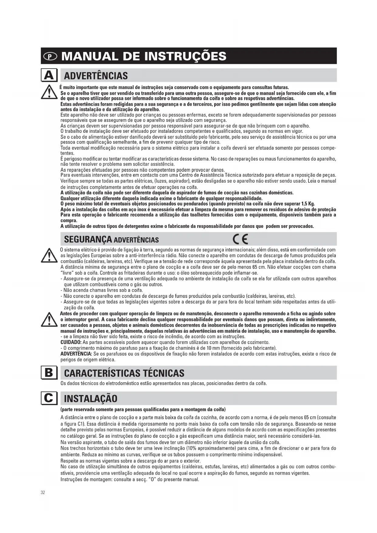 É muito importante que este manual de instruções seja conservado com o equipamento para consultas futuras. Se o aparelho tiver que ser vendido ou transferido para uma outra pessoa, assegure-se de que o manual seja fornecido com ele, a fim de que o novo utilizador possa ser informado sobre o funcionamento da coifa e sobre as respetivas advertências. Estas advertências foram redigidas para a sua segurança e a de terceiros, por isso pedimos gentilmente que sejam lidas com atenção antes da instalação e da utilização do aparelho. Este aparelho não deve ser utilizado por crianças ou pessoas enfermas, exceto se forem adequadamente supervisionadas por pessoas responsáveis que se assegurem de que o aparelho seja utilizado com segurança.As crianças devem ser supervisionadas por pessoa responsável para assegurar-se de que não brinquem com o aparelho.O trabalho de instalação deve ser efetuado por instaladores competentes e qualificados, segundo as normas em vigor. Se o cabo de alimentação estiver danificado deverá ser substituído pelo fabricante, pelo seu serviço de assistência técnica ou por uma pessoa com qualificação semelhante, a fim de prevenir qualquer tipo de risco. Toda eventual modificação necessária para o sistema elétrico para instalar a coifa deverá ser efetuada somente por pessoas compe- tentes. É perigoso modificar ou tentar modificar as características desse sistema. No caso de reparações ou maus funcionamentos do aparelho, não tente resolver o problema sem solicitar assistência.As reparações efetuadas por pessoas não competentes podem provocar danos. Para eventuais intervenções, entre em contacto com uma Centro de Assistência Técnica autorizado para efetuar a reposição de peças. Verifique sempre se todas as partes elétricas, (luzes, aspirador), estão desligadas se o aparelho não estiver sendo usado. Leia o manual de instruções completamente antes de efetuar operações na coifa.A utilização da coifa não pode ser diferente daquela de aspirador de fumos de cocção nas cozinhas domésticas.Qualquer utilização diferente daquela indicada exime o fabricante de qualquer responsabilidade.O peso máximo total de eventuais objetos posicionados ou pendurados (quando previsto) na coifa não deve superar 1,5 Kg. Após a instalação das coifas em aço inox é necessário efetuar a limpeza da mesma para remover os resíduos de adesivo de proteção Para esta operação o fabricante recomenda a utilização das toalhetes fornecidas com o equipamento, disponíveis também para a compra.A utilização de outros tipos de detergentes exime o fabricante da responsabilidade por danos que podem ser provocados.