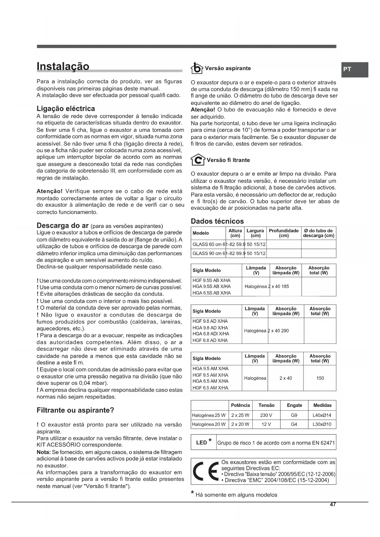 Instalação Para a instalação correcta do produto, ver as figuras disponíveis nas primeiras páginas deste manual. A instalação deve ser efectuada por pessoal qualifi cado. Ligação eléctrica A tensão de rede deve corresponder à tensão indicada na etiqueta de características situada dentro do exaustor. Se tiver uma fi cha, ligue o exaustor a uma tomada com conformidade com as normas em vigor, situada numa zona acessível. Se não tiver uma fi cha (ligação directa à rede), ou se a fi cha não puder ser colocada numa zona acessível, aplique um interruptor bipolar de acordo com as normas que assegure a desconexão total da rede nas condições da categoria de sobretensão III, em conformidade com as regras de instalação. Atenção! Verifique sempre se o cabo de rede está montado correctamente antes de voltar a ligar o circuito do exaustor à alimentação de rede e de verifi car o seu correcto funcionamento. Descarga do ar (para as versões aspirantes) Ligue o exaustor a tubos e orifícios de descarga de parede com diâmetro equivalente à saída do ar (fl ange de união). A utilização de tubos e orifícios de descarga de parede com diâmetro inferior implica uma diminuição das performances de aspiração e um sensível aumento do ruído. Declina-se qualquer responsabilidade neste caso. ! Use uma conduta com o comprimento mínimo indispensável. ! Use uma conduta com o menor número de curvas possível. ! Evite alterações drásticas de secção da conduta. ! Use uma conduta com o interior o mais liso possível. ! O material da conduta deve ser aprovado pelas normas, ! Não ligue o exaustor a condutas de descarga de fumos produzidos por combustão (caldeiras, lareiras, aquecedores, etc.). ! Para a descarga do ar a evacuar, respeite as indicações das autoridades competentes. Além disso, o ar a descarregar não deve ser eliminado através de uma cavidade na parede a menos que esta cavidade não se destine a este fi m. ! Equipe o local com condutas de admissão para evitar que o exaustor crie uma pressão negativa na divisão (que não deve superar os 0,04 mbar). ! A empresa declina qualquer responsabilidade caso estas normas não sejam respeitadas. Filtrante ou aspirante? ! O exaustor está pronto para ser utilizado na versão aspirante. Para utilizar o exaustor na versão fi ltrante, deve instalar o KIT ACESSÓRIO correspondente. Nota: Se fornecido, em alguns casos, o sistema de fi ltragem adicional à base de carvões activos pode já estar instalado no exaustor. As informações para a transformação do exaustor em versão aspirante para a versão fi ltrante estão presentes neste manual (ver "Versão fi ltrante"). Versão aspirante O exaustor depura o ar e expele-o para o exterior através de uma conduta de descarga (diâmetro 150 mm) fi xada na fl ange de união. O diâmetro do tubo de descarga deve ser equivalente ao diâmetro do anel de ligação. Atenção! O tubo de evacuação não é fornecido e deve ser adquirido. Na parte horizontal, o tubo deve ter uma ligeira inclinação para cima (cerca de 10°) de forma a poder transportar o ar para o exterior mais facilmente. Se o exaustor dispuser de fi ltros de carvão, estes devem ser retirados. Versão fi ltrante O exaustor depura o ar e emite ar limpo na divisão. Para utilizar o exaustor nesta versão, é necessário instalar um sistema de fi ltração adicional, à base de carvões activos. Para esta versão, é necessário um defl ector de ar, redução e fi ltro(s) de carvão. O tubo superior deve ter abas de evacuação de ar posicionadas na parte alta. Dados técnicos ModeloAltura (cm) Largura (cm) Profundidade (cm) Ø do tubo de descarga (cm)GLASS 60 cm 61-82 59.8 50 15/12GLASS 90 cm 61-82 89.9 50 15/12Sigla ModeloLâmpada (V) Absorção lâmpada (W)Absorção total (W)HGF 9.5S AB X/HAHGA 9.5S AB X/HAHGA 6.5S AB X/HAHalogénea 2 x 40 185Sigla ModeloLâmpada (V) Absorção lâmpada (W)Absorção total (W)HGF 9.8 AD X/HAHGA 9.8 AD X/HAHGA 6.8 ADI X/HAHGF 6.8 AD X/HAHalogénea 2 x 40 290Sigla ModeloLâmpada (V) Absorção lâmpada (W)Absorção total (W)HGA 9.5 AM X/HAHGF 9.5 AM X/HAHGA 6.5 AM X/HAHGF 6.5 AM X/HAHalogénea 2 x 40 150Potência Tensão Engate MedidasHalogénea 25 W 2 x 25 W 230 V G9 L40xØ14 Halogénea 20 W 2 x 20 W 12 V G4 L30xØ10 LED *Grupo de risco 1 de acordo com a norma EN 62471 Os exaustores estão em conformidade com as seguintes Directivas EC:
