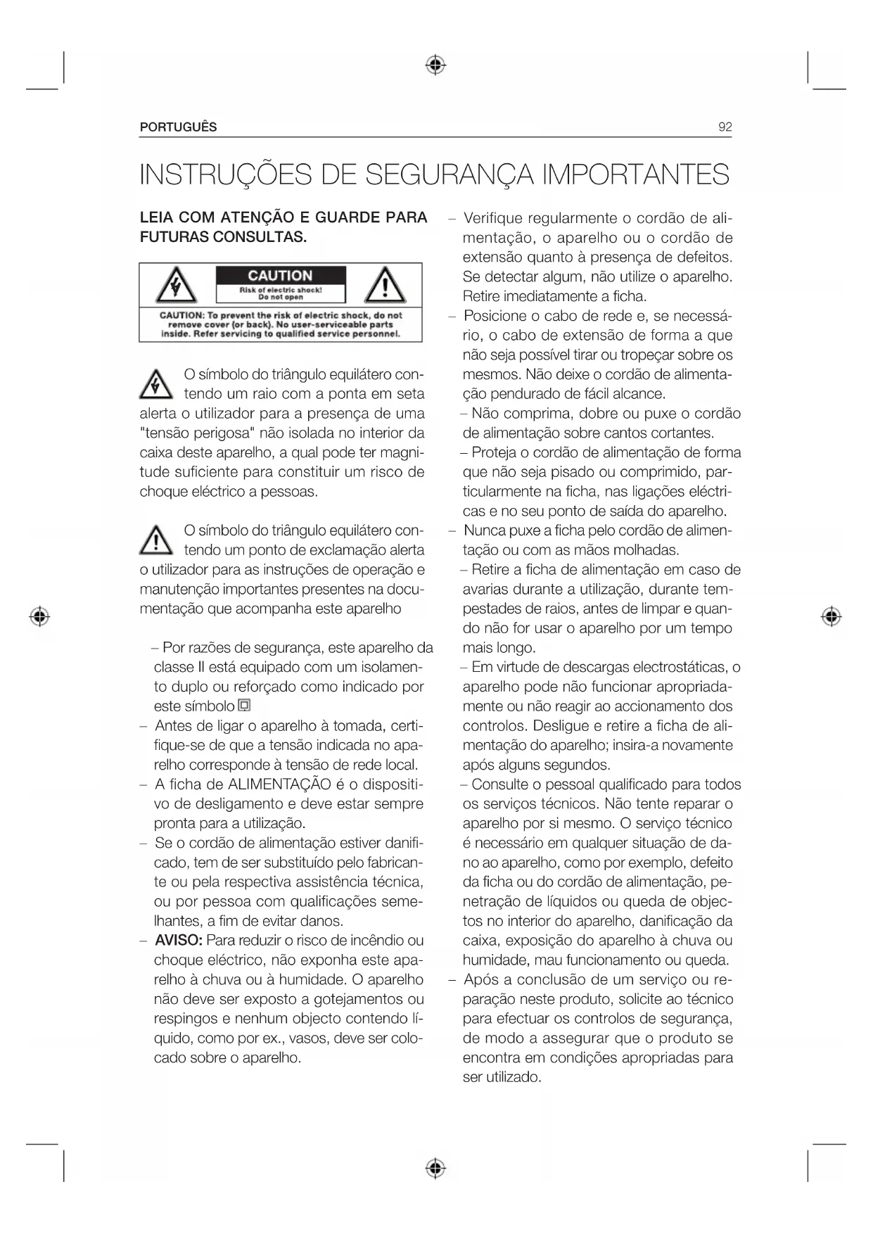 O símbolo do triângulo equilátero con- tendo um raio com a ponta em seta alerta o utilizador para a presença de uma "tensão perigosa" não isolada no interior da caixa deste aparelho, a qual pode ter magni- tude suficiente para constituir um risco de choque eléctrico a pessoas. O símbolo do triângulo equilátero con- tendo um ponto de exclamação alerta o utilizador para as instruções de operação e manutenção importantes presentes na docu- mentação que acompanha este aparelho – Por razões de segurança, este aparelho da classe II está equipado com um isolamen- to duplo ou reforçado como indicado por este símbolo . – Antes de ligar o aparelho à tomada, certi- fique-se de que a tensão indicada no apa- relho corresponde à tensão de rede local. – A ficha de ALIMENTAÇÃO é o dispositi- vo de desligamento e deve estar sempre pronta para a utilização. – Se o cordão de alimentação estiver danifi- cado, tem de ser substituído pelo fabrican- te ou pela respectiva assistência técnica, ou por pessoa com qualificações seme- lhantes, a fim de evitar danos. – AVISO: Para reduzir o risco de incêndio ou choque eléctrico, não exponha este apa- relho à chuva ou à humidade. O aparelho não deve ser exposto a gotejamentos ou respingos e nenhum objecto contendo lí- quido, como por ex., vasos, deve ser colo- cado sobre o aparelho.