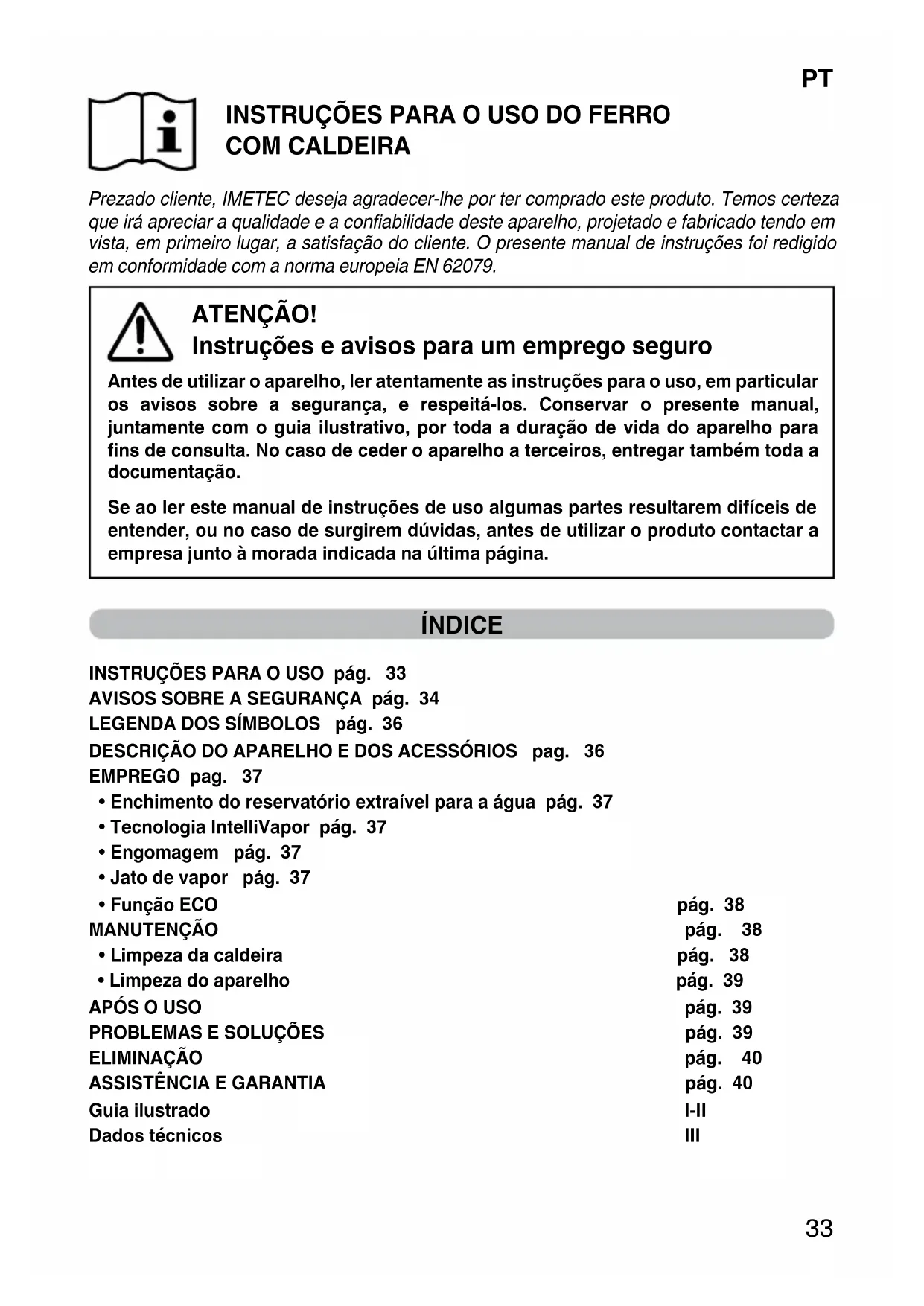 INSTRUÇÕES PARA O USO DO FERRO COM CALDEIRA Prezado cliente, IMETEC deseja agradecer-lhe por ter comprado este produto. Temos certeza