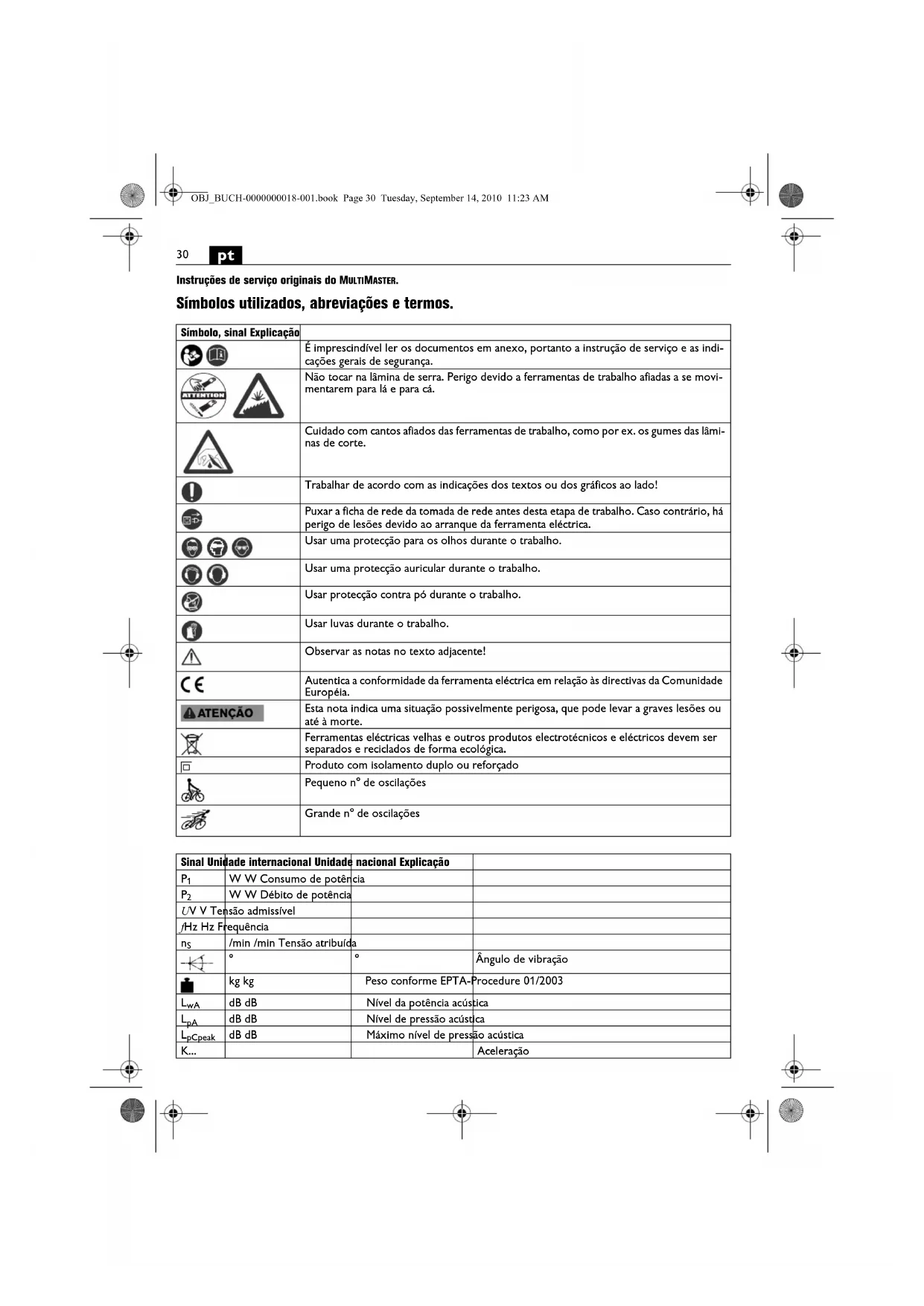 Instruções de serviço originais do MULTIMASTER. Símbolos utilizados, abreviações e termos. Símbolo, sinal Explicação É imprescindível ler os documentos em anexo, portanto a instrução de serviço e as indi- cações gerais de segurança. Não tocar na lâmina de serra. Perigo devido a ferramentas de trabalho afiadas a se movi- mentarem para lá e para cá. Cuidado com cantos afiados das ferramentas de trabalho, como por ex. os gumes das lâmi- nas de corte. Trabalhar de acordo com as indicações dos textos ou dos gráficos ao lado! Puxar a ficha de rede da tomada de rede antes desta etapa de trabalho. Caso contrário, há perigo de lesões devido ao arranque da ferramenta eléctrica. Usar uma protecção para os olhos durante o trabalho. Usar uma protecção auricular durante o trabalho. Usar protecção contra pó durante o trabalho. Usar luvas durante o trabalho. Observar as notas no texto adjacente! Autentica a conformidade da ferramenta eléctrica em relação às directivas da Comunidade Européia. Esta nota indica uma situação possivelmente perigosa, que pode levar a graves lesões ou até à morte. Ferramentas eléctricas velhas e outros produtos electrotécnicos e eléctricos devem ser separados e reciclados de forma ecológica. Produto com isolamento duplo ou reforçado Pequeno n° de oscilações Grande n° de oscilações Sinal Unidade internacional Unidade nacional Explicação