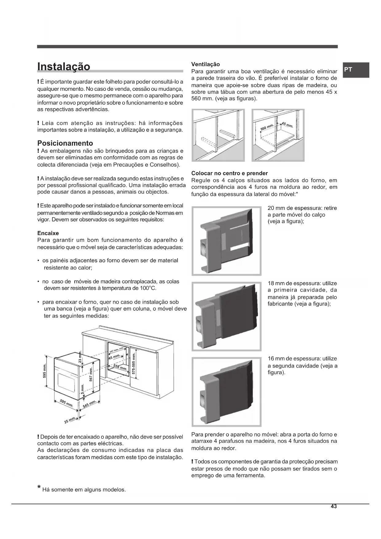 - para encaixar o forno, quer no caso de instalação sob uma banca (veja a gura) quer em coluna, o móvel deve ter as seguintes medidas: 595 mm. 595 mm.25 mm.545 mm.5 mm.567 mm.23 mm.575-585 mm.45 mm.558 mm. 547 mm. min. ! Depois de ter encaixado o aparelho, não deve ser possível contacto com as partes eléctricas. As declarações de consumo indicadas na placa das características foram medidas com este tipo de instalação. Ventilação Para garantir uma boa ventilação é necessário eliminar a parede traseira do vão. É preferível instalar o forno de maneira que apoie-se sobre duas ripas de madeira, ou sobre uma tábua com uma abertura de pelo menos 45 x 560 mm. (veja as guras). 560 mm. 45 mm. Colocar no centro e prender Regule os 4 calços situados aos lados do forno, em correspondência aos 4 furos na moldura ao redor, em função da espessura da lateral do móvel:* 20 mm de espessura: retire a parte móvel do calço (veja a gura); 18 mm de espessura: utilize a primeira cavidade, da maneira já preparada pelo fabricante (veja a gura); 16 mm de espessura: utilize a segunda cavidade (veja a gura). Para prender o aparelho no móvel: abra a porta do forno e atarraxe 4 parafusos na madeira, nos 4 furos situados na moldura ao redor. ! Todos os componentes de garantia da protecção precisam estar presos de modo que não possam ser tirados sem o emprego de uma ferramenta.