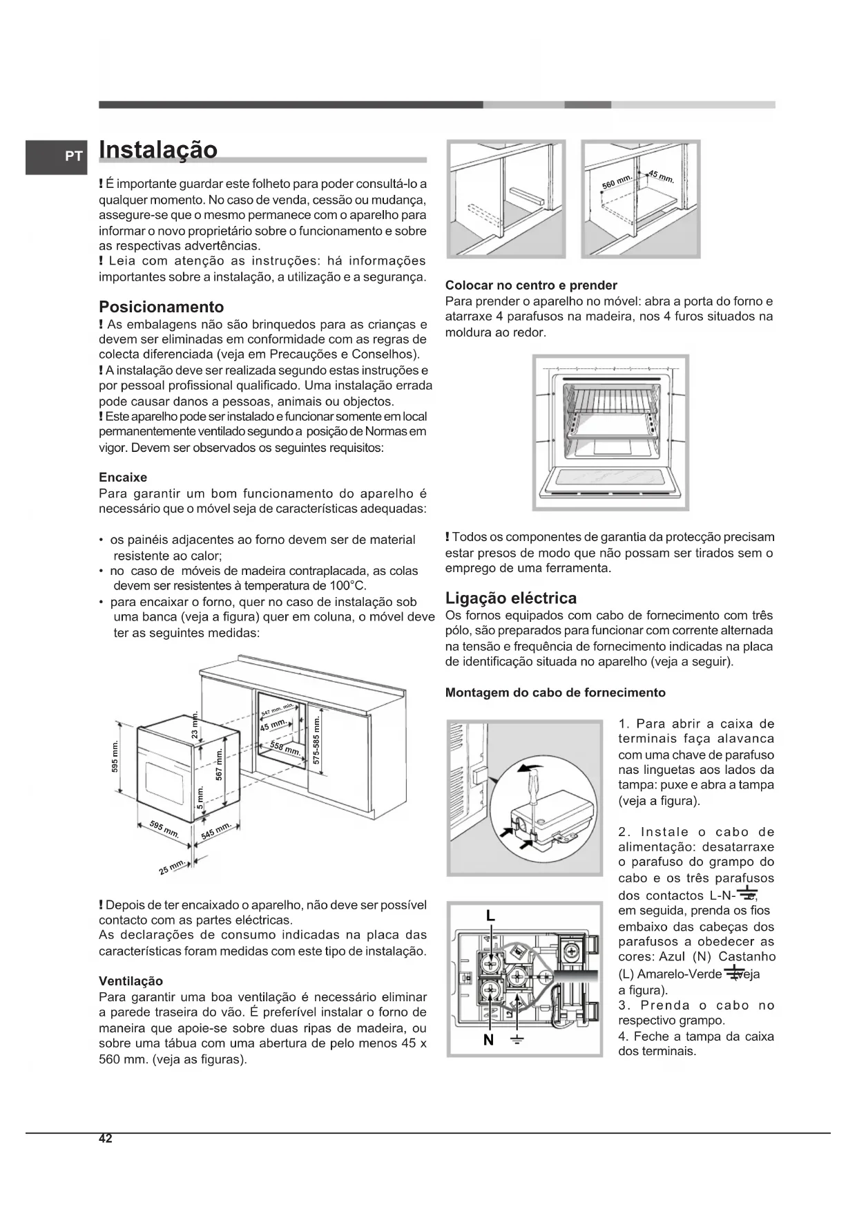 - para encaixar o forno, quer no caso de instalação sob uma banca (veja a gura) quer em coluna, o móvel deve ter as seguintes medidas: 595 mm. 595 mm. 25 mm. 545 mm.5 mm.567 mm.23 mm.575-585 mm.45 mm.558 mm. 547 mm. min. ! Depois de ter encaixado o aparelho, não deve ser possível contacto com as partes eléctricas. As declarações de consumo indicadas na placa das características foram medidas com este tipo de instalação. Ventilação Para garantir uma boa ventilação é necessário eliminar a parede traseira do vão. É preferível instalar o forno de maneira que apoie-se sobre duas ripas de madeira, ou sobre uma tábua com uma abertura de pelo menos 45 x 560 mm. (veja as guras). 560 mm. 45 mm. Colocar no centro e prender Para prender o aparelho no móvel: abra a porta do forno e atarraxe 4 parafusos na madeira, nos 4 furos situados na moldura ao redor. ! Todos os componentes de garantia da protecção precisam estar presos de modo que não possam ser tirados sem o emprego de uma ferramenta. Ligação eléctrica Os fornos equipados com cabo de fornecimento com três pólo, são preparados para funcionar com corrente alternada na tensão e frequência de fornecimento indicadas na placa de identicação situada no aparelho (veja a seguir). Montagem do cabo de fornecimento