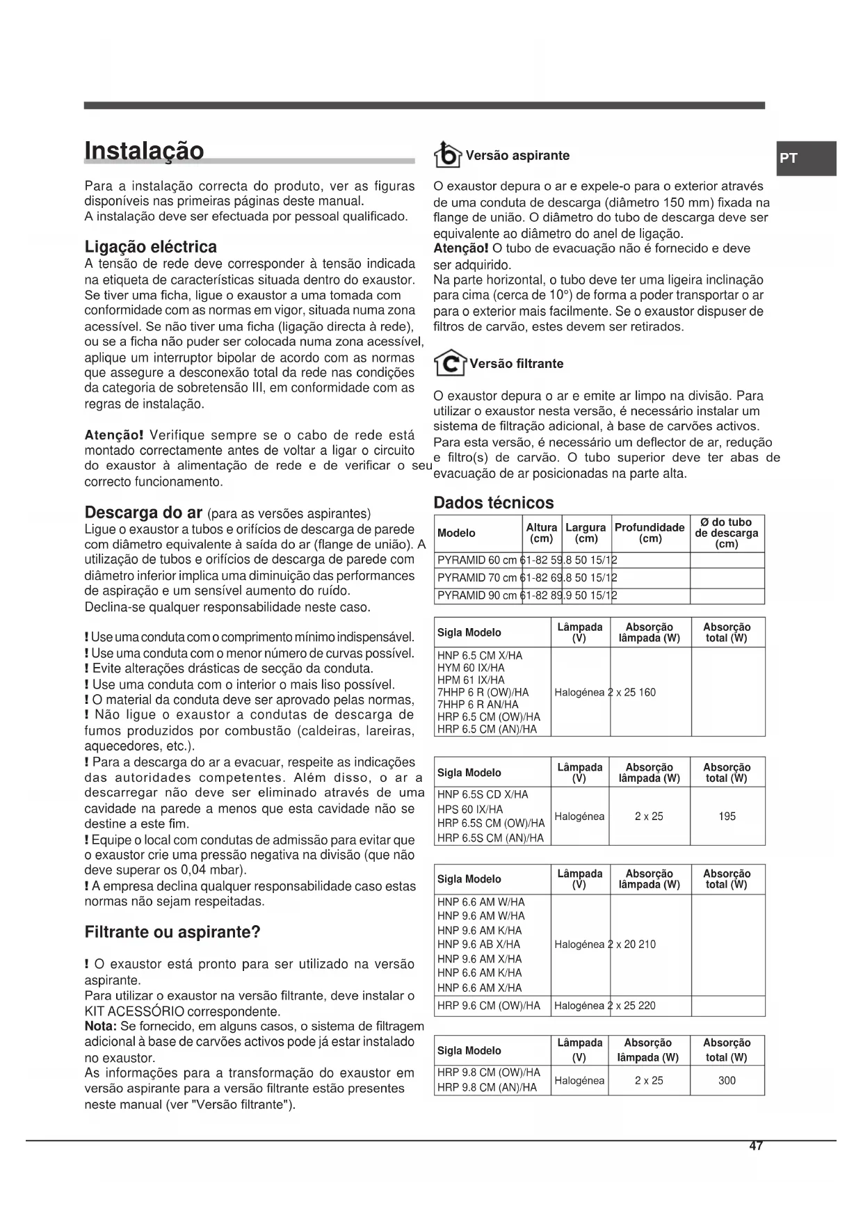 Instalação Para a instalação correcta do produto, ver as figuras disponíveis nas primeiras páginas deste manual. A instalação deve ser efectuada por pessoal qualicado. Ligação eléctrica A tensão de rede deve corresponder à tensão indicada na etiqueta de características situada dentro do exaustor. Se tiver uma cha, ligue o exaustor a uma tomada com conformidade com as normas em vigor, situada numa zona acessível. Se não tiver uma cha (ligação directa à rede), ou se a cha não puder ser colocada numa zona acessível, aplique um interruptor bipolar de acordo com as normas que assegure a desconexão total da rede nas condições da categoria de sobretensão III, em conformidade com as regras de instalação. Atenção! Verifique sempre se o cabo de rede está montado correctamente antes de voltar a ligar o circuito do exaustor à alimentação de rede e de vericar o seu correcto funcionamento. Descarga do ar (para as versões aspirantes) Ligue o exaustor a tubos e orifícios de descarga de parede com diâmetro equivalente à saída do ar (ange de união). A utilização de tubos e orifícios de descarga de parede com diâmetro inferior implica uma diminuição das performances de aspiração e um sensível aumento do ruído. Declina-se qualquer responsabilidade neste caso. ! Use uma conduta com o comprimento mínimo indispensável. ! Use uma conduta com o menor número de curvas possível. ! Evite alterações drásticas de secção da conduta. ! Use uma conduta com o interior o mais liso possível. ! O material da conduta deve ser aprovado pelas normas, ! Não ligue o exaustor a condutas de descarga de fumos produzidos por combustão (caldeiras, lareiras, aquecedores, etc.). ! Para a descarga do ar a evacuar, respeite as indicações das autoridades competentes. Além disso, o ar a descarregar não deve ser eliminado através de uma cavidade na parede a menos que esta cavidade não se destine a este m. ! Equipe o local com condutas de admissão para evitar que o exaustor crie uma pressão negativa na divisão (que não deve superar os 0,04 mbar). ! A empresa declina qualquer responsabilidade caso estas normas não sejam respeitadas. Filtrante ou aspirante? ! O exaustor está pronto para ser utilizado na versão aspirante. Para utilizar o exaustor na versão ltrante, deve instalar o KIT ACESSÓRIO correspondente. Nota: Se fornecido, em alguns casos, o sistema de ltragem adicional à base de carvões activos pode já estar instalado no exaustor. As informações para a transformação do exaustor em versão aspirante para a versão ltrante estão presentes neste manual (ver "Versão ltrante"). Versão aspirante O exaustor depura o ar e expele-o para o exterior através de uma conduta de descarga (diâmetro 150 mm) xada na ange de união. O diâmetro do tubo de descarga deve ser equivalente ao diâmetro do anel de ligação. Atenção! O tubo de evacuação não é fornecido e deve ser adquirido. Na parte horizontal, o tubo deve ter uma ligeira inclinação para cima (cerca de 10°) de forma a poder transportar o ar para o exterior mais facilmente. Se o exaustor dispuser de ltros de carvão, estes devem ser retirados. Versão ltrante O exaustor depura o ar e emite ar limpo na divisão. Para utilizar o exaustor nesta versão, é necessário instalar um sistema de ltração adicional, à base de carvões activos. Para esta versão, é necessário um deector de ar, redução e ltro(s) de carvão. O tubo superior deve ter abas de evacuação de ar posicionadas na parte alta. Dados técnicos ModeloAltura (cm) Largura (cm) Profundidade (cm) Ø do tubo de descarga (cm) PYRAMID 60 cm 61-82 59.8 50 15/12PYRAMID 70 cm 61-82 69.8 50 15/12PYRAMID 90 cm 61-82 89.9 50 15/12Sigla ModeloLâmpada (V) Absorção lâmpada (W)Absorção total (W)HNP 6.5 CM X/HAHYM 60 IX/HAHPM 61 IX/HA7HHP 6 R (OW)/HA7HHP 6 R AN/HAHRP 6.5 CM (OW)/HAHRP 6.5 CM (AN)/HAHalogénea 2 x 25 160Sigla ModeloLâmpada (V) Absorção lâmpada (W)Absorção total (W)HNP 6.5S CD X/HAHPS 60 IX/HAHRP 6.5S CM (OW)/HAHRP 6.5S CM (AN)/HAHalogénea 2 x 25 195Sigla ModeloLâmpada (V) Absorção lâmpada (W)Absorção total (W)HNP 6.6 AM W/HAHNP 9.6 AM W/HAHNP 9.6 AM K/HAHNP 9.6 AB X/HAHNP 9.6 AM X/HAHNP 6.6 AM K/HAHNP 6.6 AM X/HAHalogénea 2 x 20 210HRP 9.6 CM (OW)/HA Halogénea 2 x 25 220Sigla ModeloLâmpada (V) Absorção lâmpada (W)Absorção total (W)HRP 9.8 CM (OW)/HAHRP 9.8 CM (AN)/HAHalogénea 2 x 25 30048