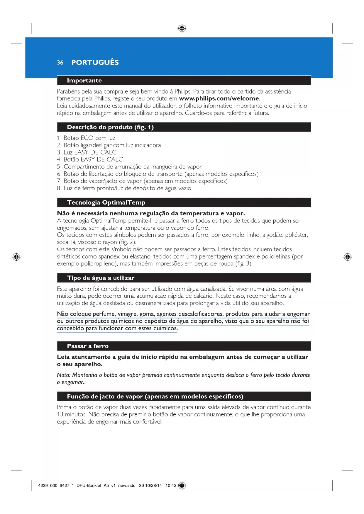 4239_000_9427_1_DFU-Booklet_A5_v1_new.indd 36 10/28/14 10:42 AMPoupança de energia - modo ECO Ao utilizar o modo ECO (quantidade reduzida de vapor), pode economizar energia sem