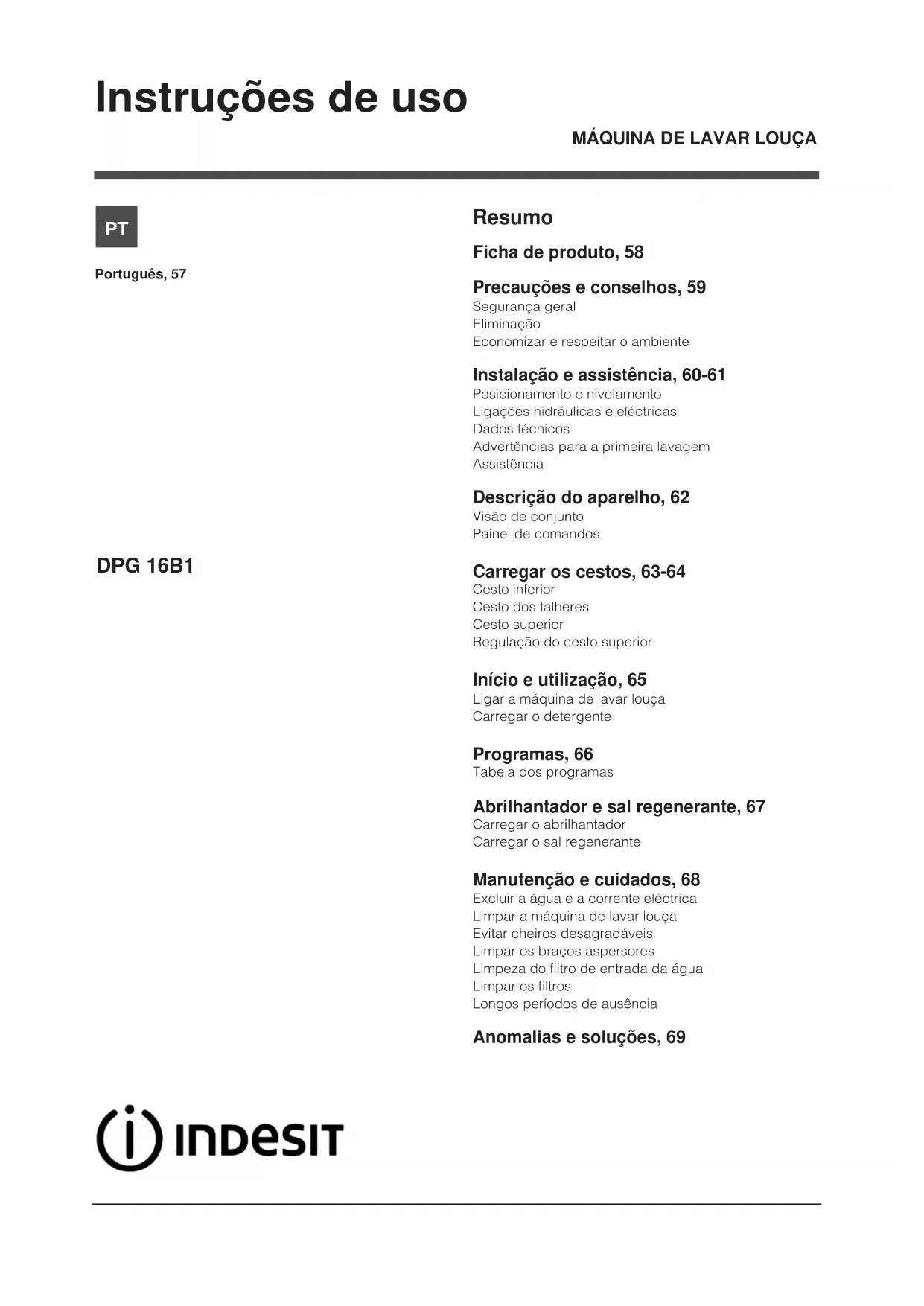 DPG 16B1 A NX EU - Máquinas de lavar loiça INDESIT - Manual de utilização gratuito