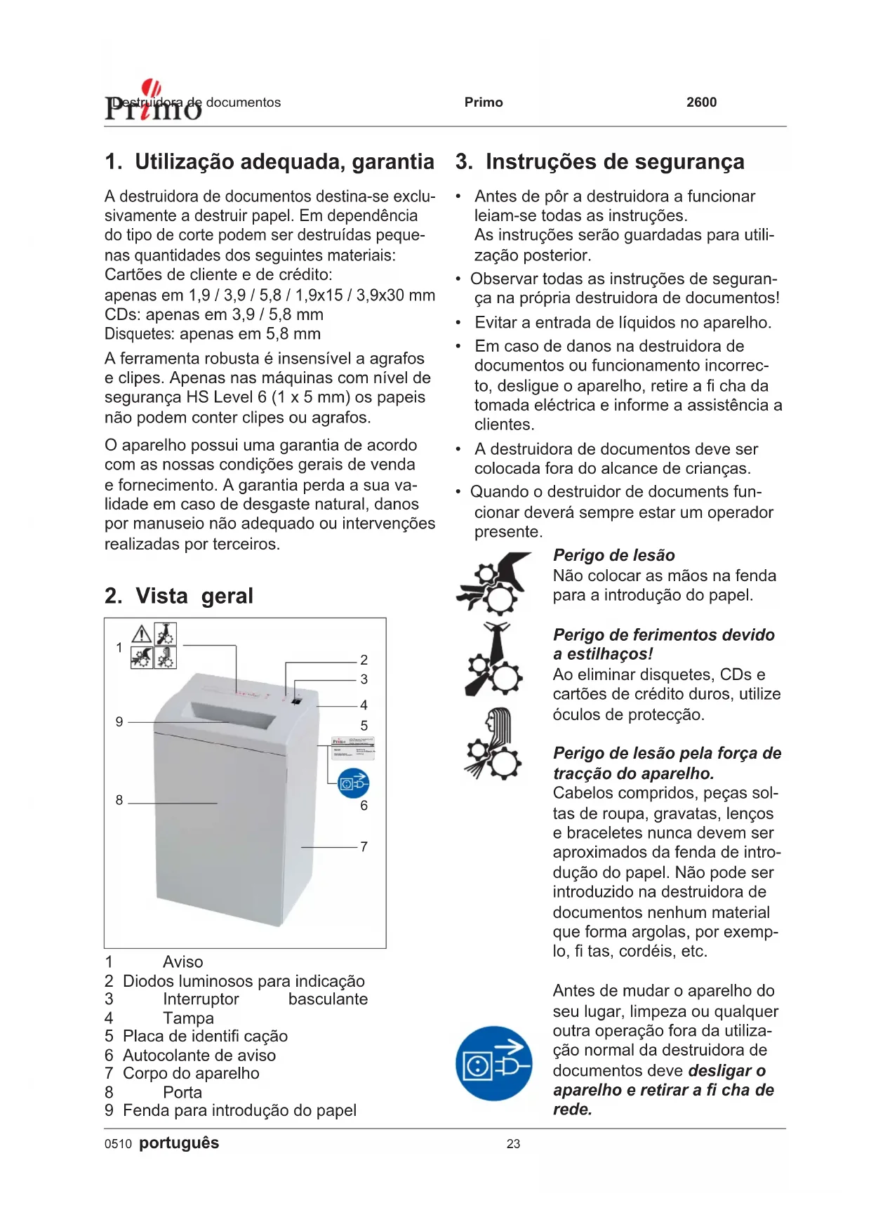 Utilização adequada, garantia A destruidora de documentos destina-se exclu- sivamente a destruir papel. Em dependência do tipo de corte podem ser destruídas peque- nas quantidades dos seguintes materiais: Cartões de cliente e de crédito: apenas em 1,9 / 3,9 / 5,8 / 1,9x15 / 3,9x30 mm CDs: apenas em 3,9 / 5,8 mm Disquetes : apenas em 5,8 mm A ferramenta robusta é insensível a agrafos e clipes. Apenas nas máquinas com nível de segurança HS Level 6 (1 x 5 mm) os papeis não podem conter clipes ou agrafos. O aparelho possui uma garantia de acordo com as nossas condições gerais de venda e fornecimento. A garantia perda a sua va- lidade em caso de desgaste natural, danos por manuseio não adequado ou intervenções realizadas por terceiros.Primo 2600 Destruidora de documentos 24 português 0510