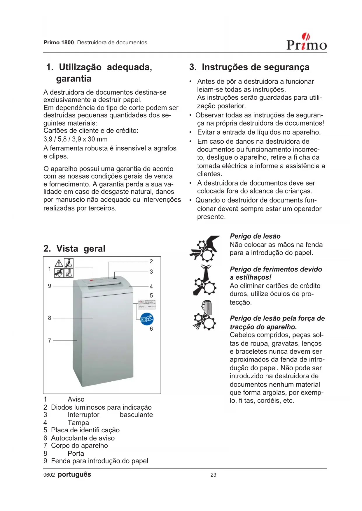 - Quando o destruidor de documents fun- cionar deverá sempre estar um operador presente. Perigo de lesão Não colocar as mãos na fenda para a introdução do papel. Perigo de ferimentos devido a estilhaços! Ao eliminar cartões de crédito duros, utilize óculos de pro- tecção. Perigo de lesão pela força de tracção do aparelho. Cabelos compridos, peças sol- tas de roupa, gravatas, lenços e braceletes nunca devem ser aproximados da fenda de intro- dução do papel. Não pode ser introduzido na destruidora de documentos nenhum material que forma argolas, por exemp- lo, fi tas, cordéis, etc. 1 Aviso 2 Diodos luminosos para indicação 3 Interruptor basculante 4 Tampa 5 Placa de identifi cação 6 Autocolante de aviso 7 Corpo do aparelho 8 Porta 9 Fenda para introdução do papel