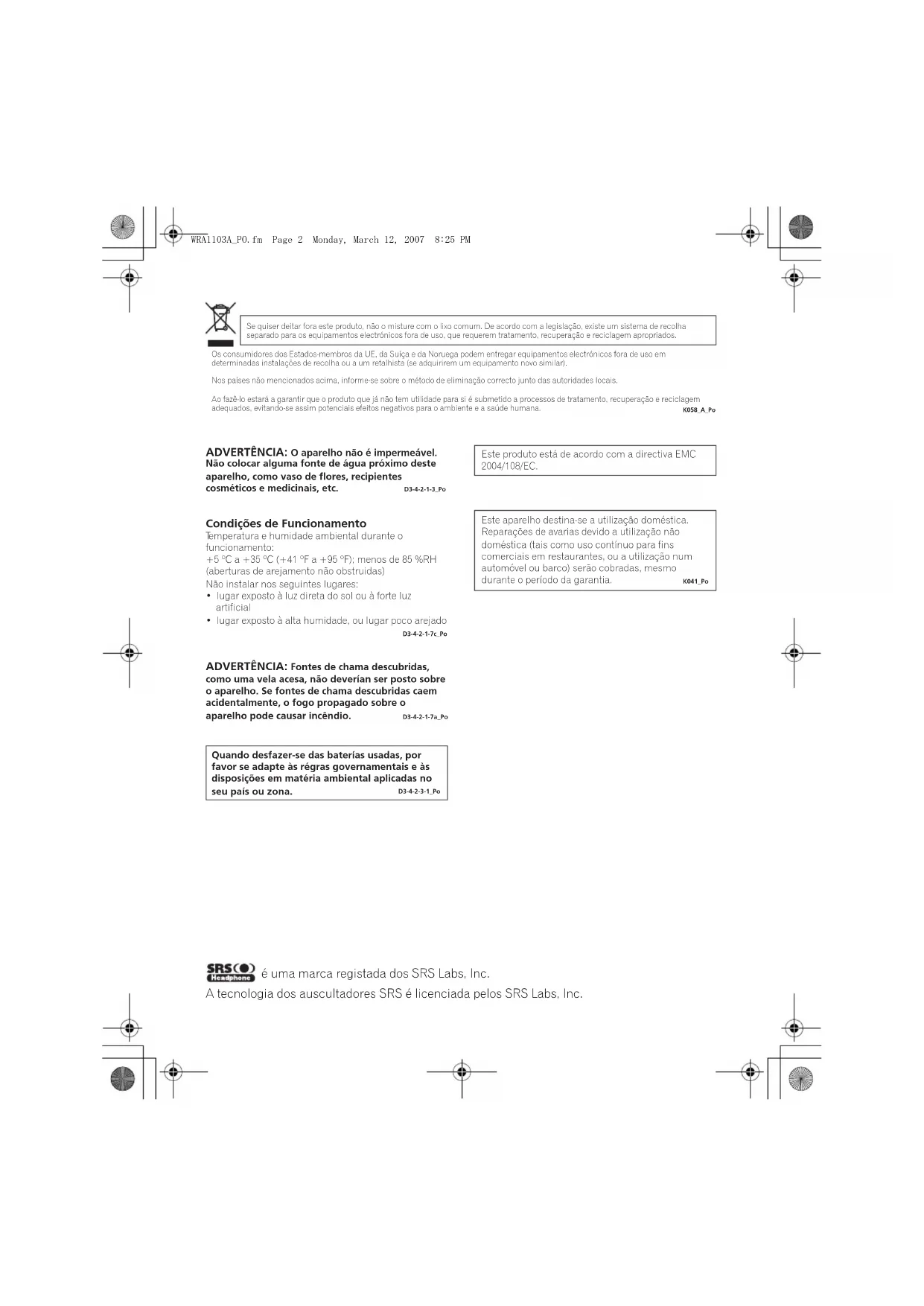 - lugar exposto à alta humidade, ou lugar poco arejado D3-4-2-1-7c_Po ADVERTÊNCIA: Fontes de chama descubridas, como uma vela acesa, não deverían ser posto sobre o aparelho. Se fontes de chama descubridas caem acidentalmente, o fogo propagado sobre o aparelho pode causar incêndio. D3-4-2-1-7a_Po Quando desfazer-se das baterías usadas, por favor se adapte às régras governamentais e às disposições em matéria ambiental aplicadas no seu país ou zona. D3-4-2-3-1_Po é uma marca registada dos SRS Labs, Inc. A tecnologia dos auscultadores SRS é licenciada pelos SRS Labs, Inc. WRA1103A_PO.fm Page 2 Monday, March 12, 2007 8:25 PM3