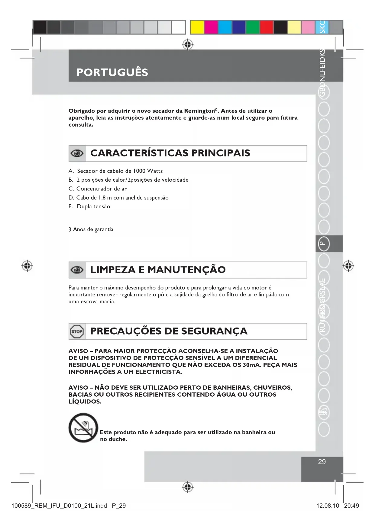 D0100 - Secador de cabelo REMINGTON - Manual de utilização gratuito