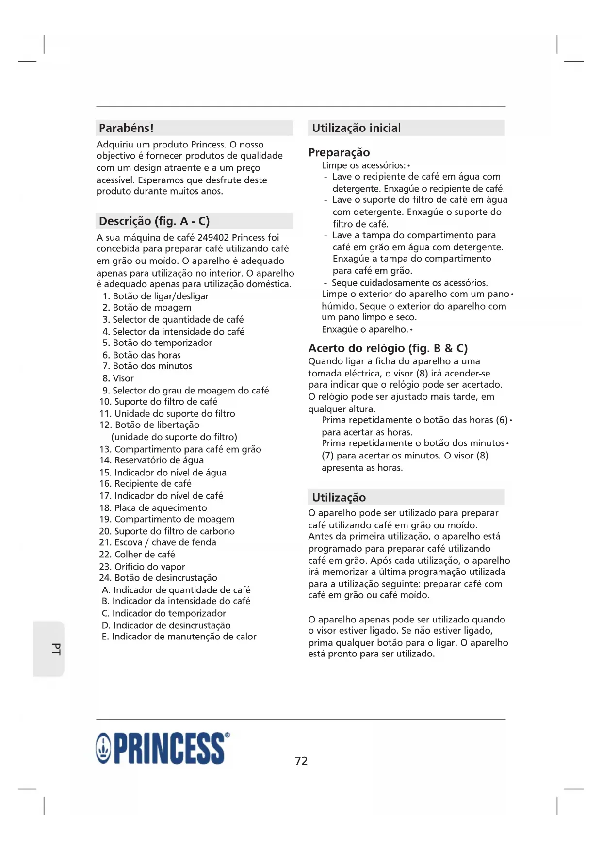 Parabéns! Adquiriu um produto Princess. O nosso objectivo é fornecer produtos de qualidade com um design atraente e a um preço acessível. Esperamos que desfrute deste produto durante muitos anos. Descrição (fig. A - C) A sua máquina de café 249402 Princess foi concebida para preparar café utilizando café em grão ou moído. O aparelho é adequado apenas para utilização no interior. O aparelho é adequado apenas para utilização doméstica.