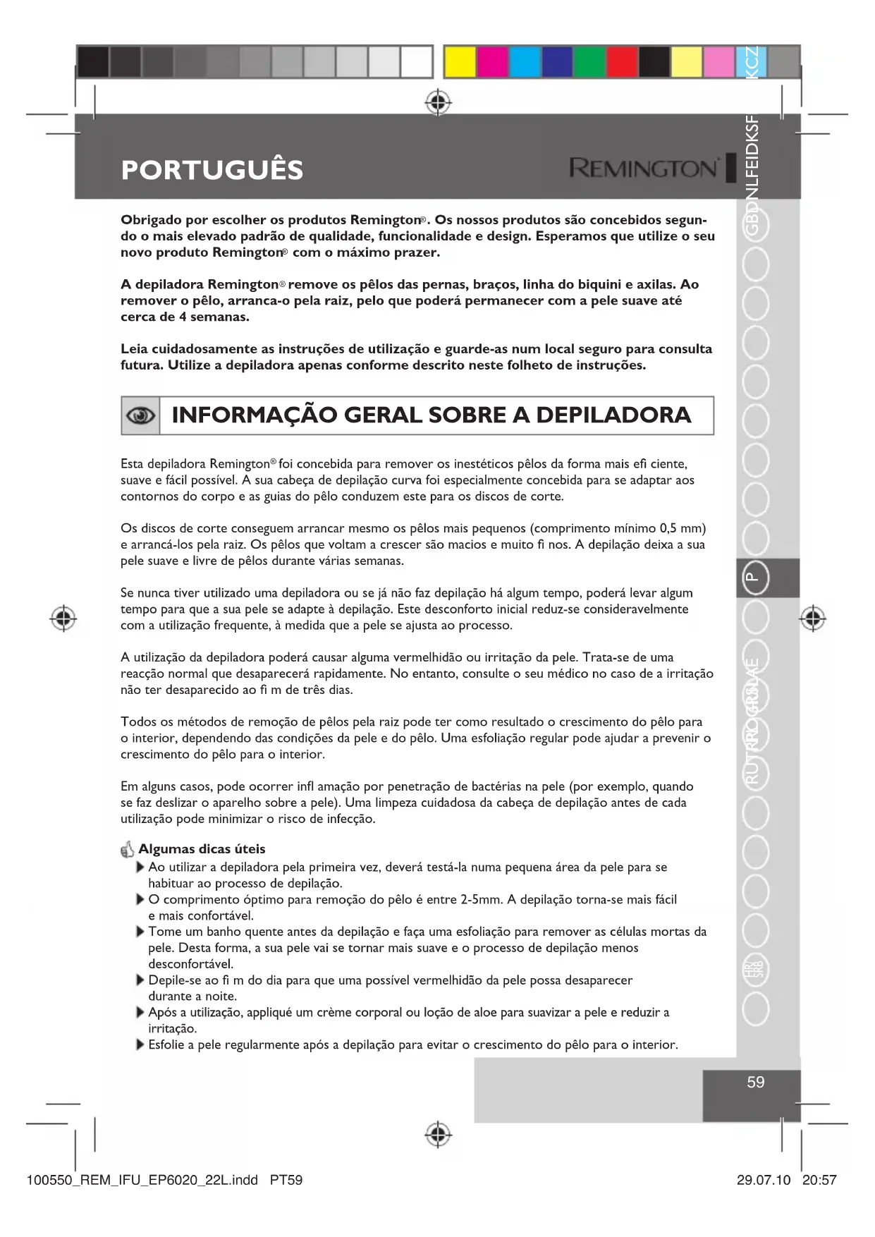 serviços de assistência autorizados ou em locais de recolha adequados. Para mais informações sobre reciclagem, ver nosso site www.remington-europe.com 100550_REM_IFU_EP6020_22L.indd PT64100550_REM_IFU_EP6020_22L.indd PT64 29.07.10 20:5729.07.10 20:5765 GBDNLFEIDKSFINPSKCZ HUN