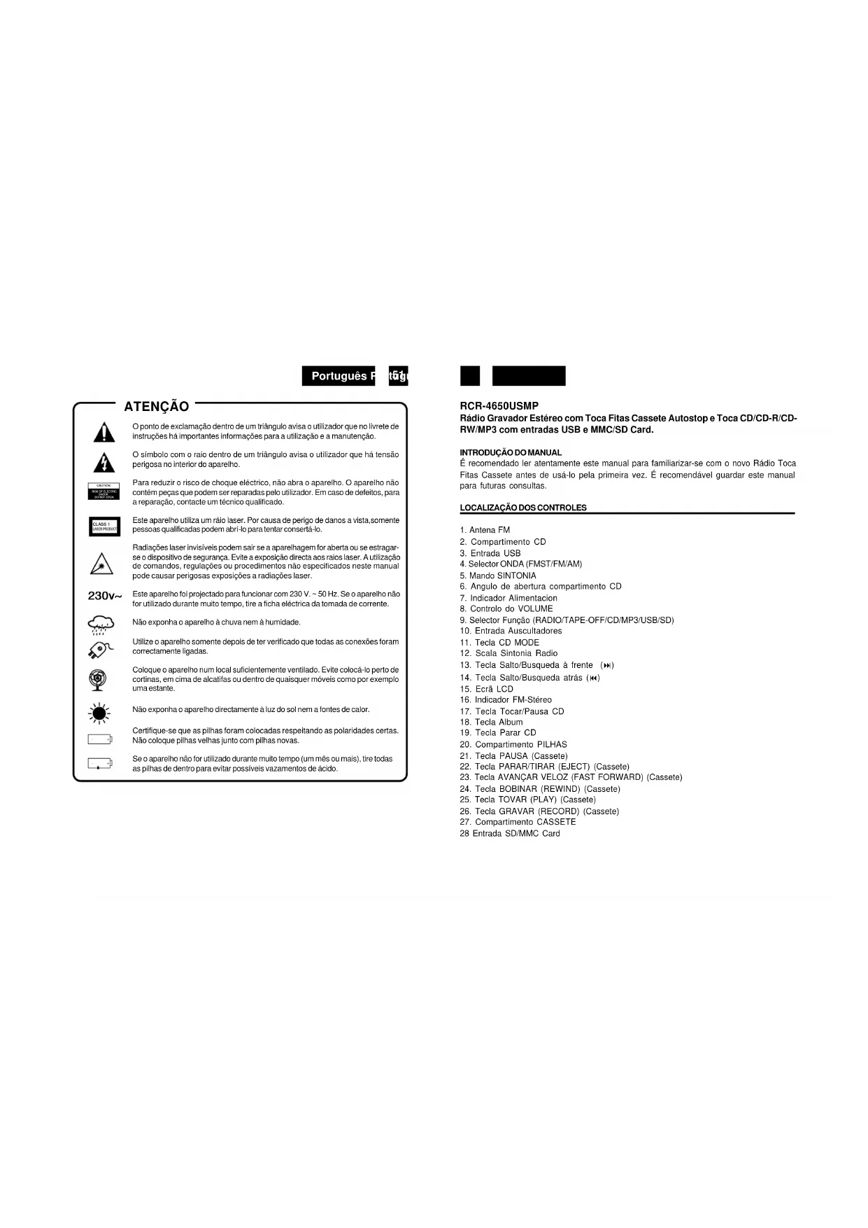 Este aparelho utiliza um ráio laser. Por causa de perigo de danos a vista, somente pessoas qualificadas podem abrí-lo para tentar consortá-lo.