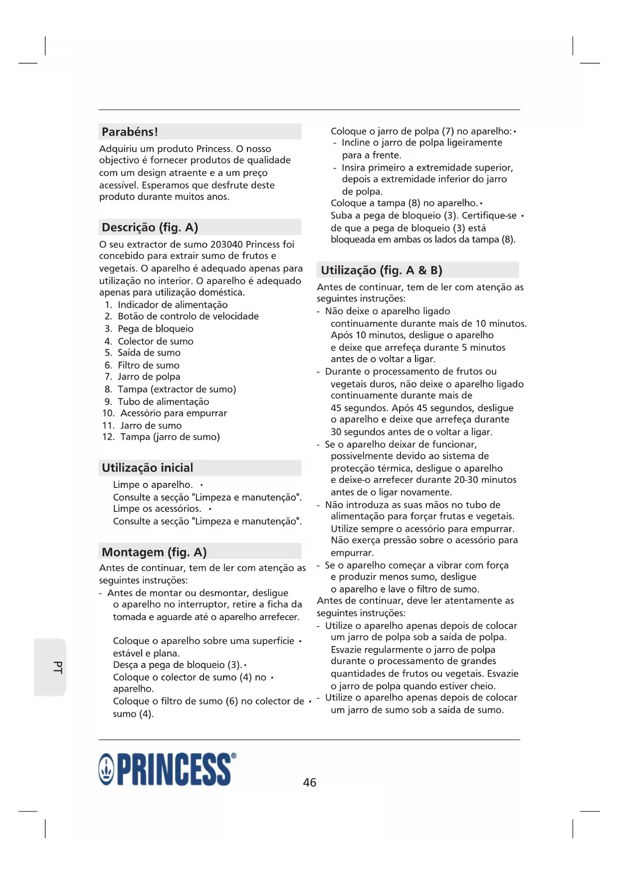 Parabéns! Adquiriu um produto Princess. O nosso objectivo é fornecer produtos de qualidade com um design atraente e a um preço acessível. Esperamos que desfrute deste produto durante muitos anos. Descrição (fig. A) O seu extractor de sumo 203040 Princess foi concebido para extrair sumo de frutos e vegetais. O aparelho é adequado apenas para utilização no interior. O aparelho é adequado apenas para utilização doméstica.