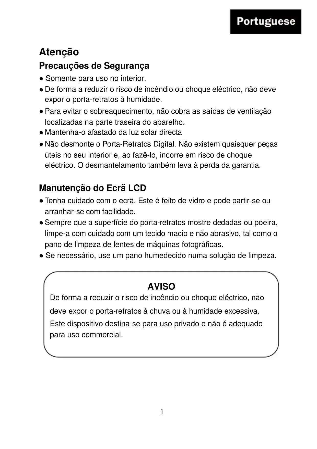 ● Não desmonte o Porta-Retratos Digital. Não existem quaisquer peças