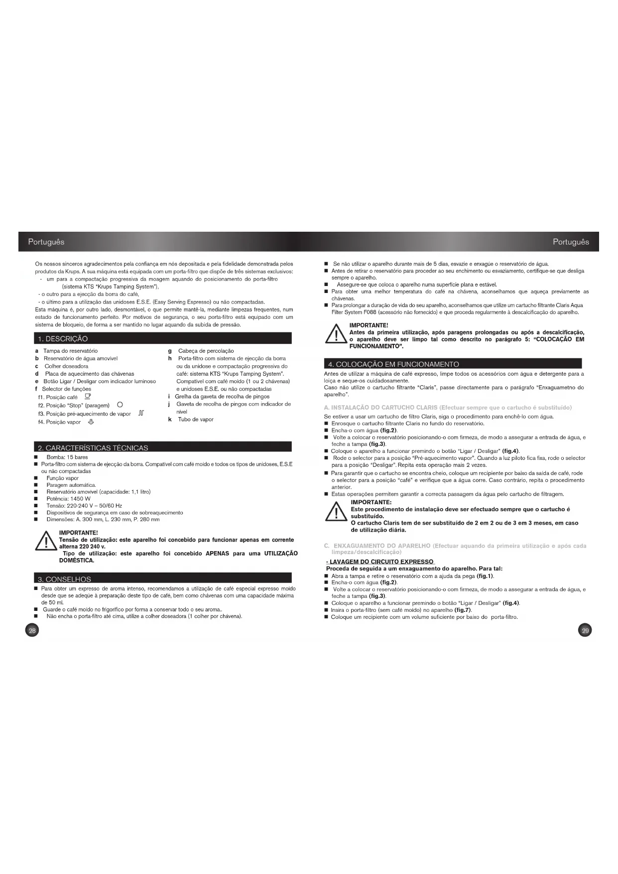 4. COLOCAÇÃO EM FUNCIONAMENTO Antes de utilizar a máquina de café expresso, limpe todos os acessórios com água e detergente para a