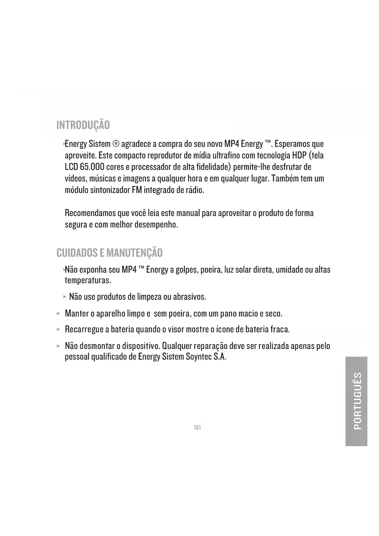 Energy Sistem ® agradece a compra do seu novo MP4 Energy ™. Esperamos que aproveite. Este compacto reprodutor de mídia ultrafino com tecnologia HDP (tela LCD 65.000 cores e processador de alta fidelidade) permite-lhe desfrutar de vídeos, músicas e imagens a qualquer hora e em qualquer lugar. Também tem um módulo sintonizador FM integrado de rádio.