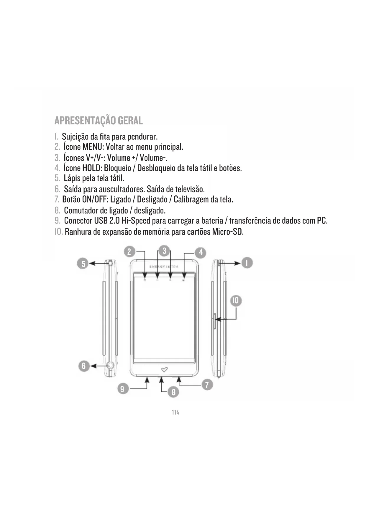 9. Conector USB 2.0 Hi-Speed para carregar a bateria / transferência de dados com PC.
