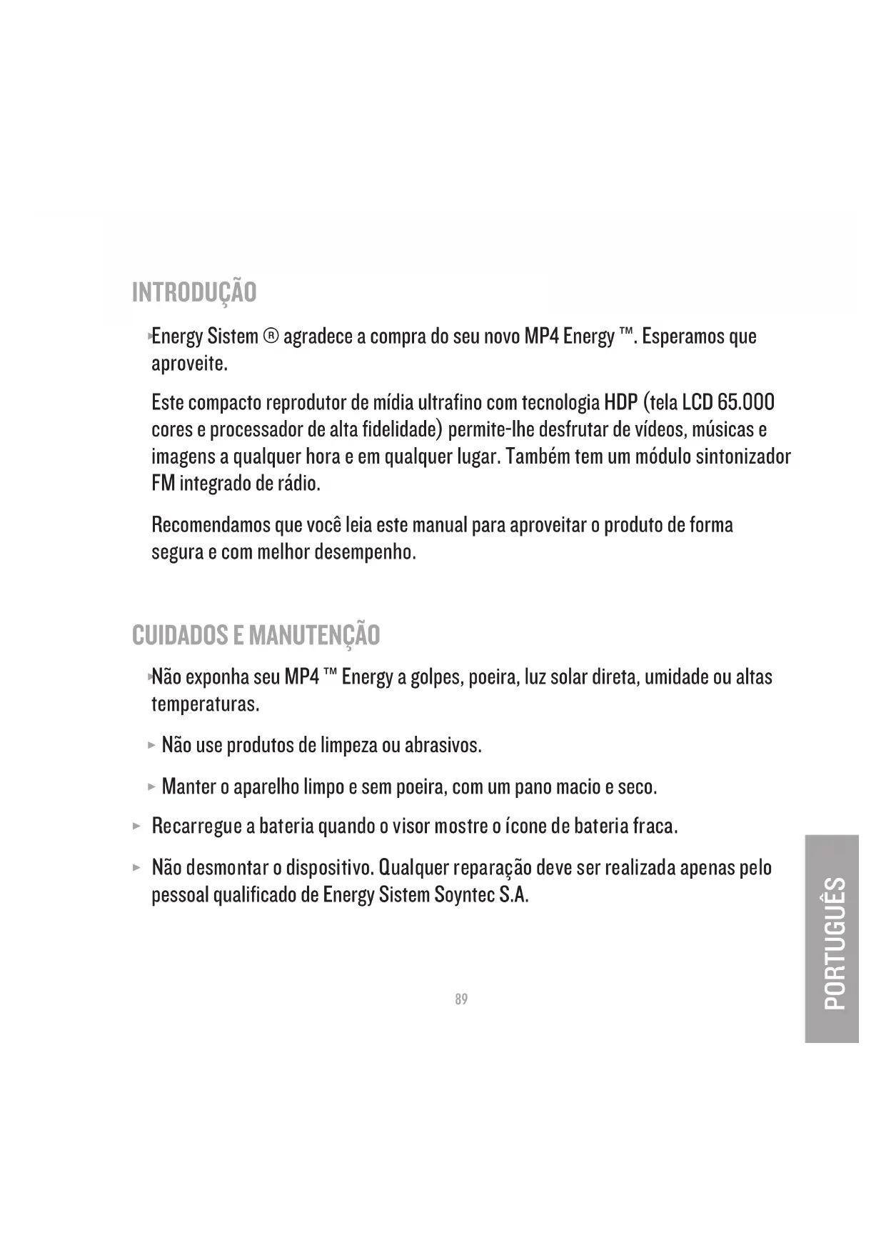Não exponha seu MP4 ™ Energy a golpes, poeira, luz solar direta, umidade ou altas temperaturas. ≥ Não use produtos de limpeza ou abrasivos. ≥ Manter o aparelho limpo e sem poeira, com um pano macio e seco. ≥ Recarregue a bateria quando o visor mostre o ícone de bateria fraca. ≥ Não desmontar o dispositivo. Qualquer reparação deve ser realizada apenas pelo pessoal qualificado de Energy Sistem Soyntec S.A.90