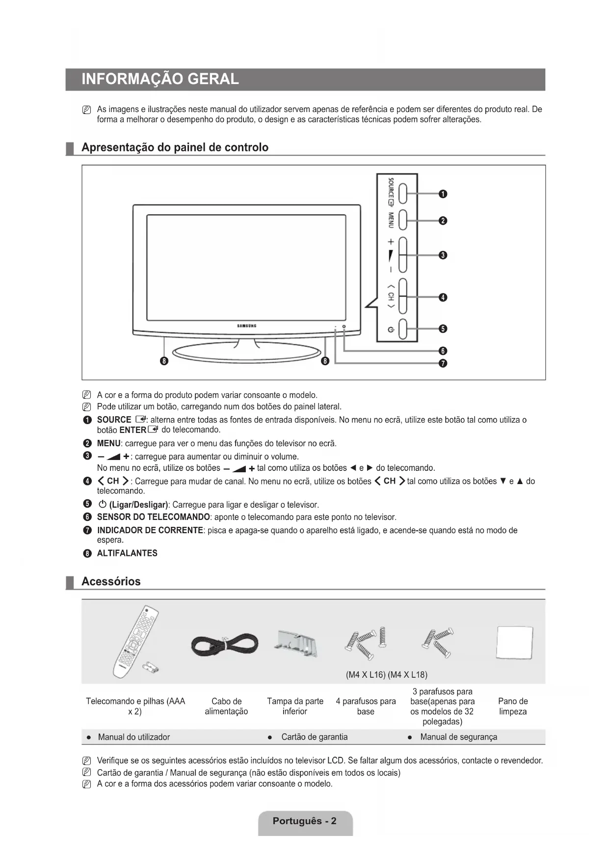 ALTIFALANTES Acessórios (M4 X L16) (M4 X L18) Telecomando e pilhas (AAA x 2) Cabo de alimentação Tampa da parte inferior 4 parafusos para base 3 parafusos para base(apenas para os modelos de 32 polegadas) Pano de limpeza Manual do utilizador