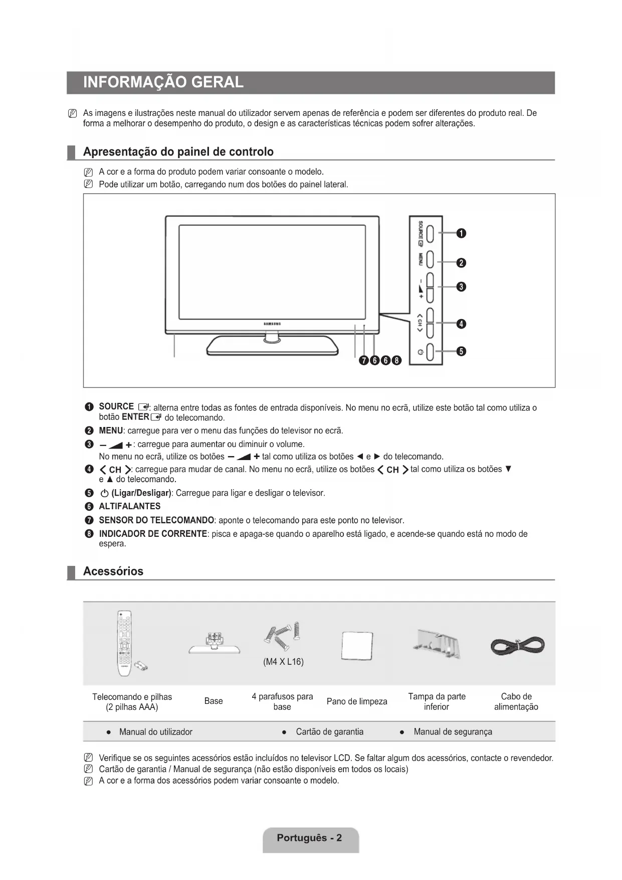 INDICADOR DE CORRENTE: pisca e apaga-se quando o aparelho está ligado, e acende-se quando está no modo de espera. Acessórios (M4 X L16)Telecomando e pilhas (2 pilhas AAA) Base 4 parafusos para base Pano de limpeza Tampa da parte inferiorCabo de alimentaçãoManual do utilizador ● Cartão de garantia ● Manual de segurança ●